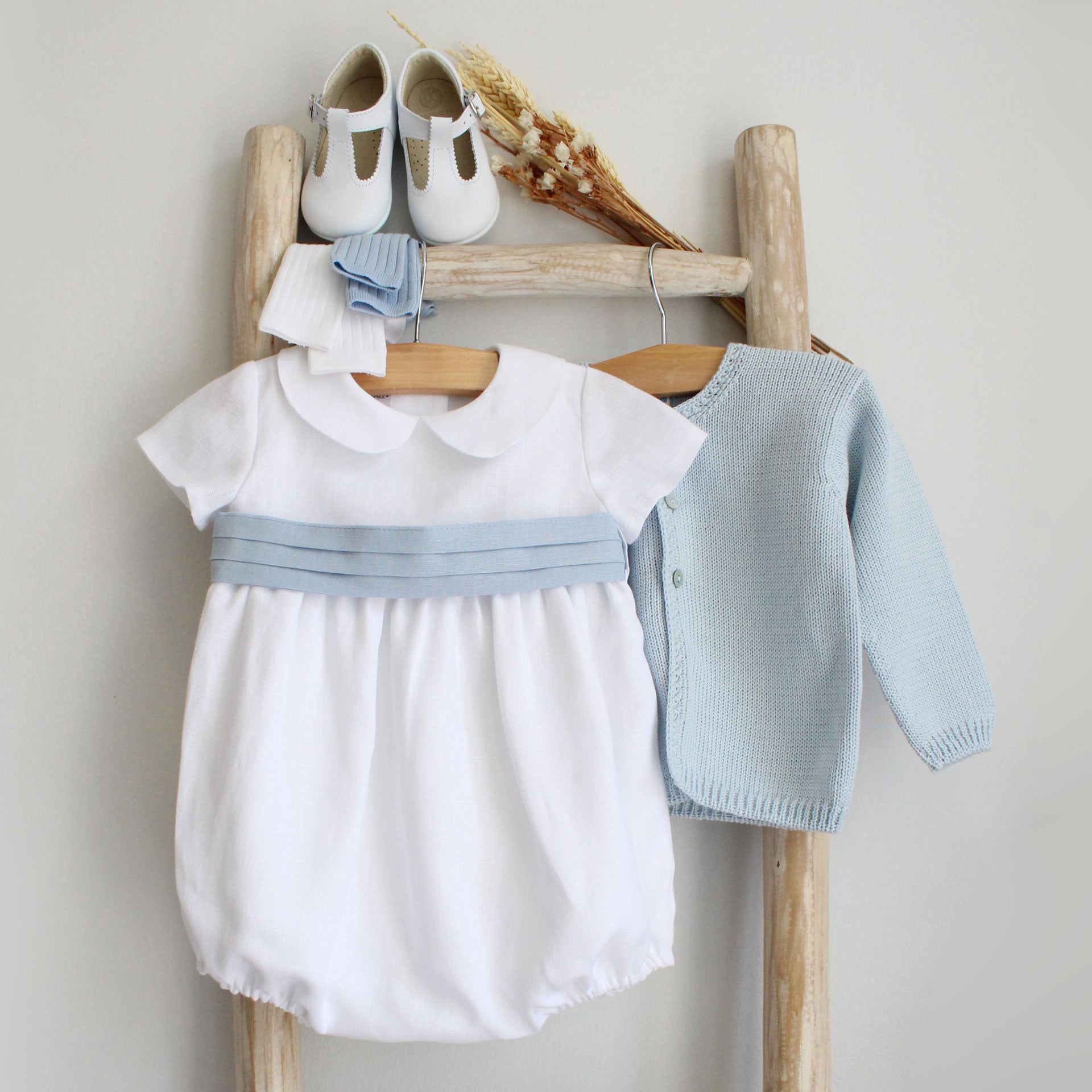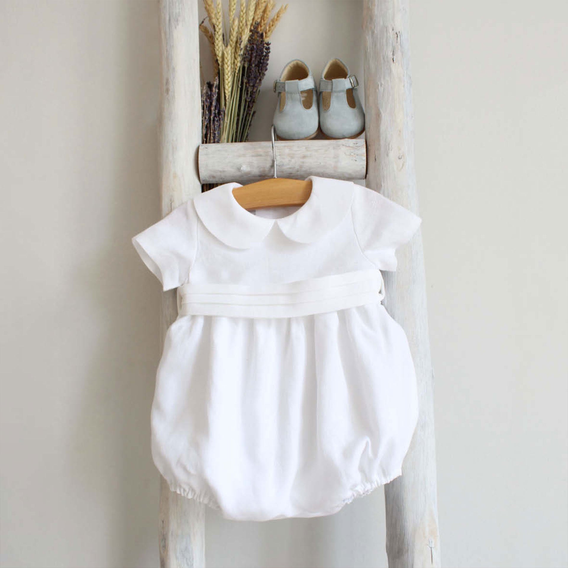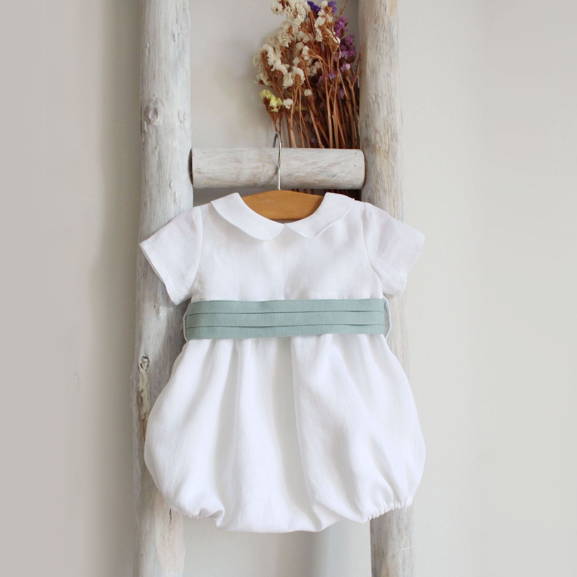 Dieser elegante kurzärmlige Strampler ist aus leichtem Leinen gefertigt und verfügt über einen klassischen Peter-Pan-Kragen und einen Taillengürtel für ein raffiniertes Finish. Sein zeitloses Design macht ihn zur perfekten Wahl für besondere Anlässe. Dieser Strampler ist für eine glatte Passform vollständig gefüttert und wird mit Sorgfalt in Portugal hergestellt.