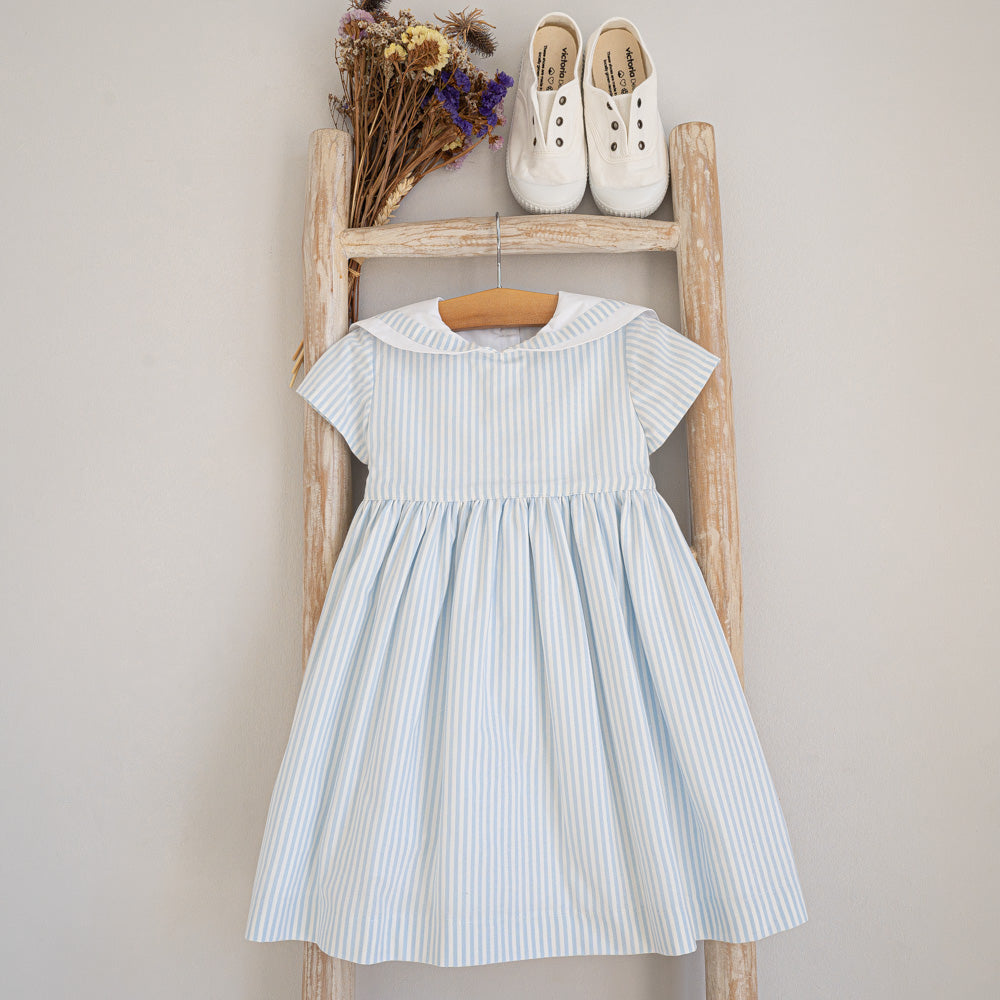 Bezauberndes Kleid mit klassischen blau-weißen Streifen und einem Kragen im Matrosenstil. Kurze Ärmel und komplett gefüttert für zusätzlichen Komfort. Hergestellt in Portugal.