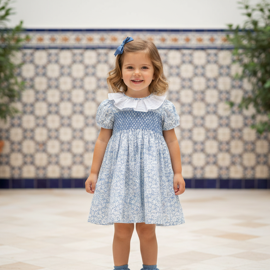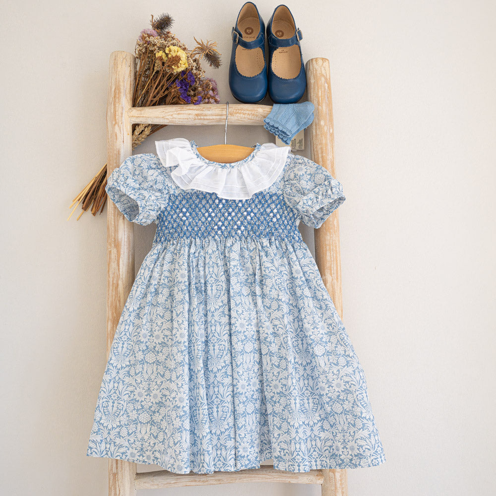 Elegantes Kleid aus Liberty-Stoff mit handbesticktem Smok-Oberteil und Rüschenkragen. Komplett gefüttert für mehr Komfort, mit Bindegürtel für eine perfekte Passform. Hergestellt in Portugal.