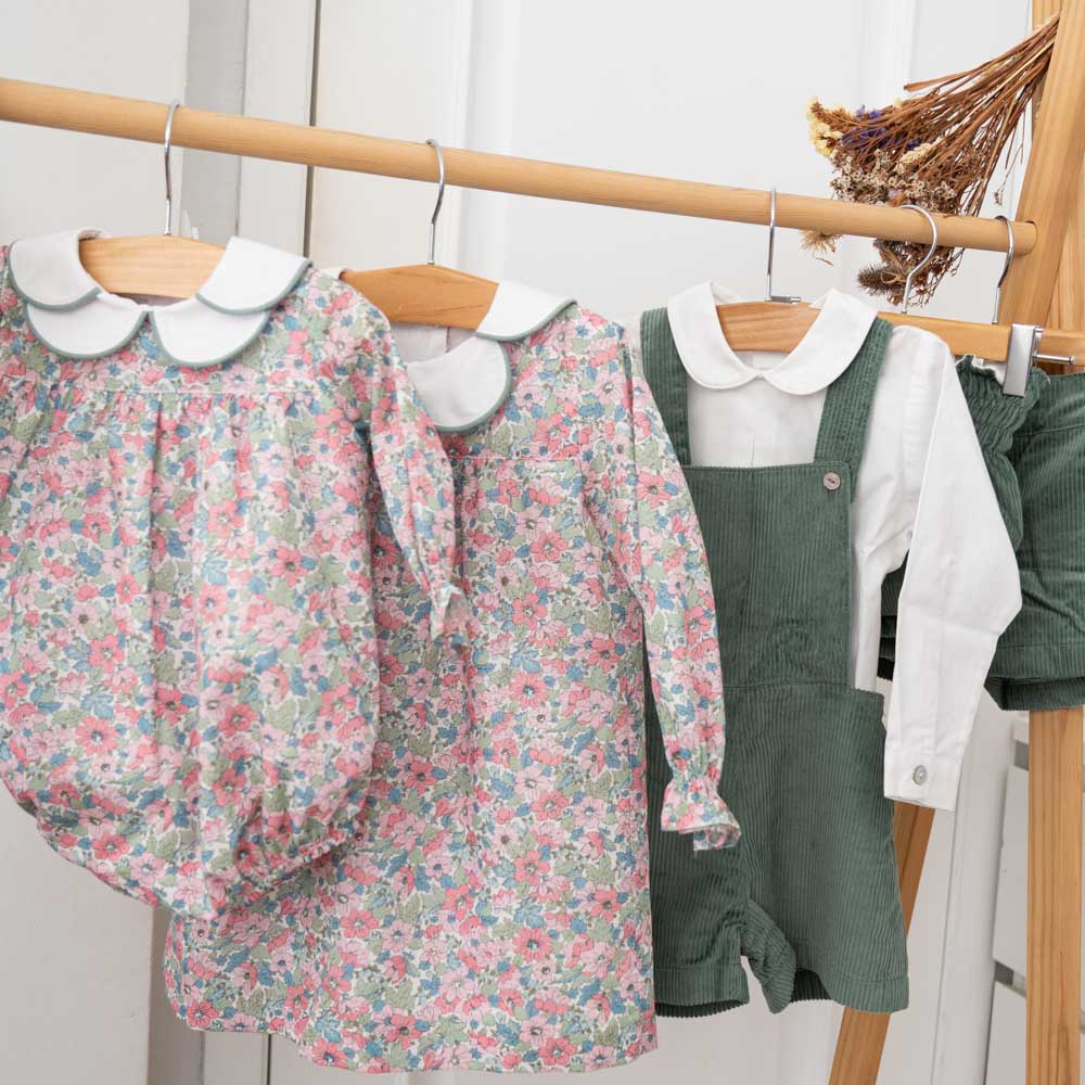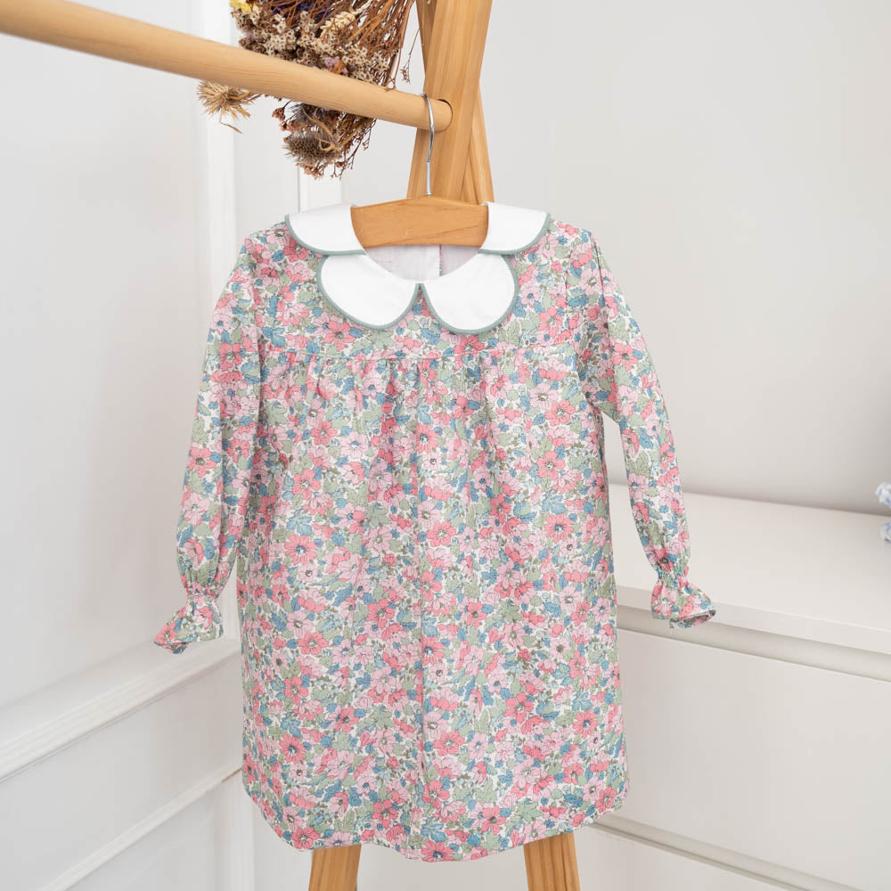 Girls' Liberty Print Dress featuring a Scalloped Collar with a green trim. Fully lined. 100% cotton (Liberty Fabric).
