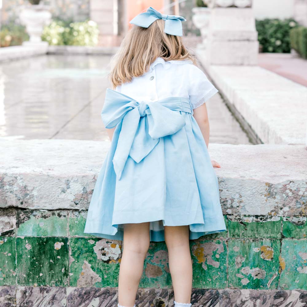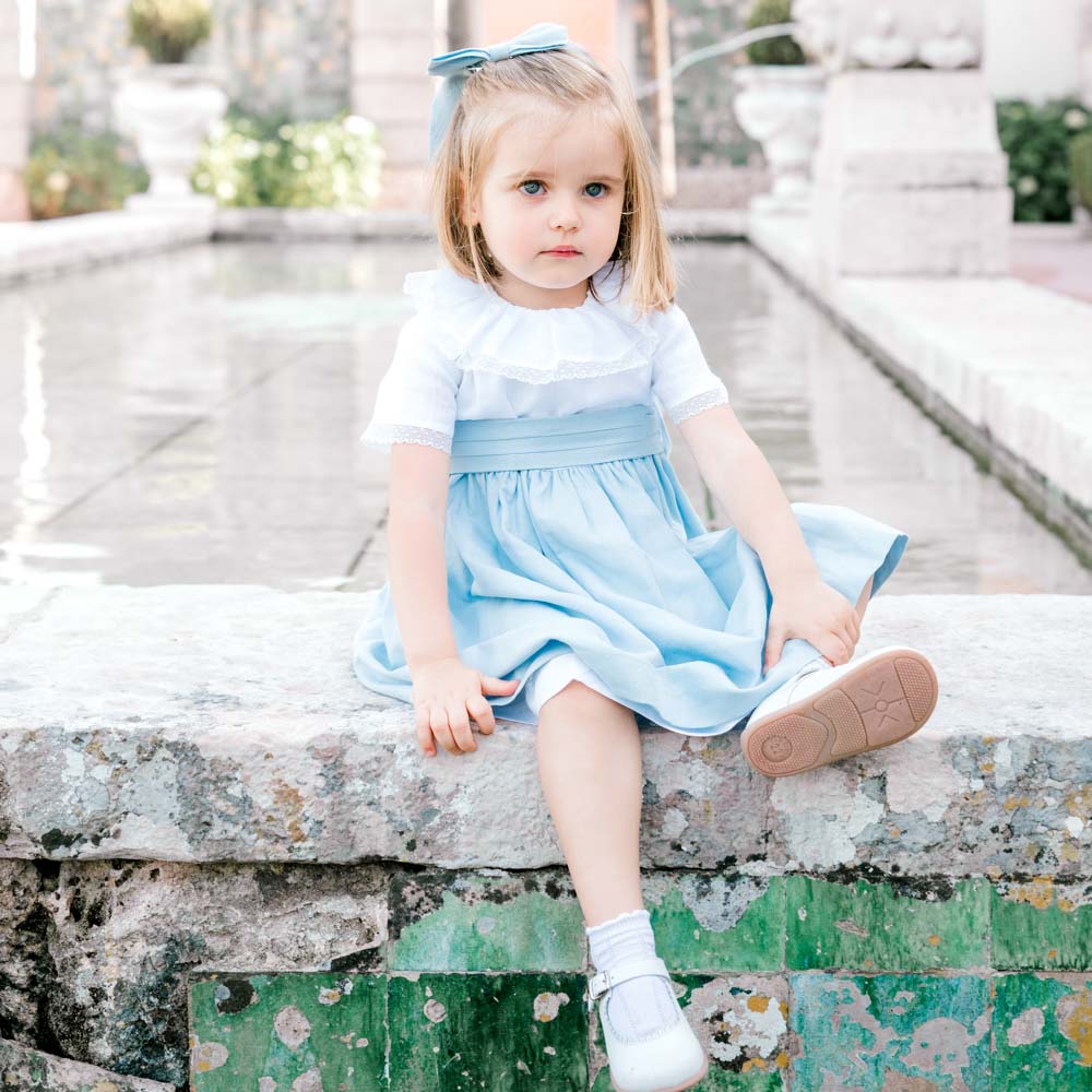Delicate and elegant, our Linen Dress is perfect for special occasions. Featuring a crisp white bodice, a light blue skirt, and a frilled collar, it exudes timeless charm. The short sleeves and a sash that ties into a beautiful bow at the back add to its graceful design.