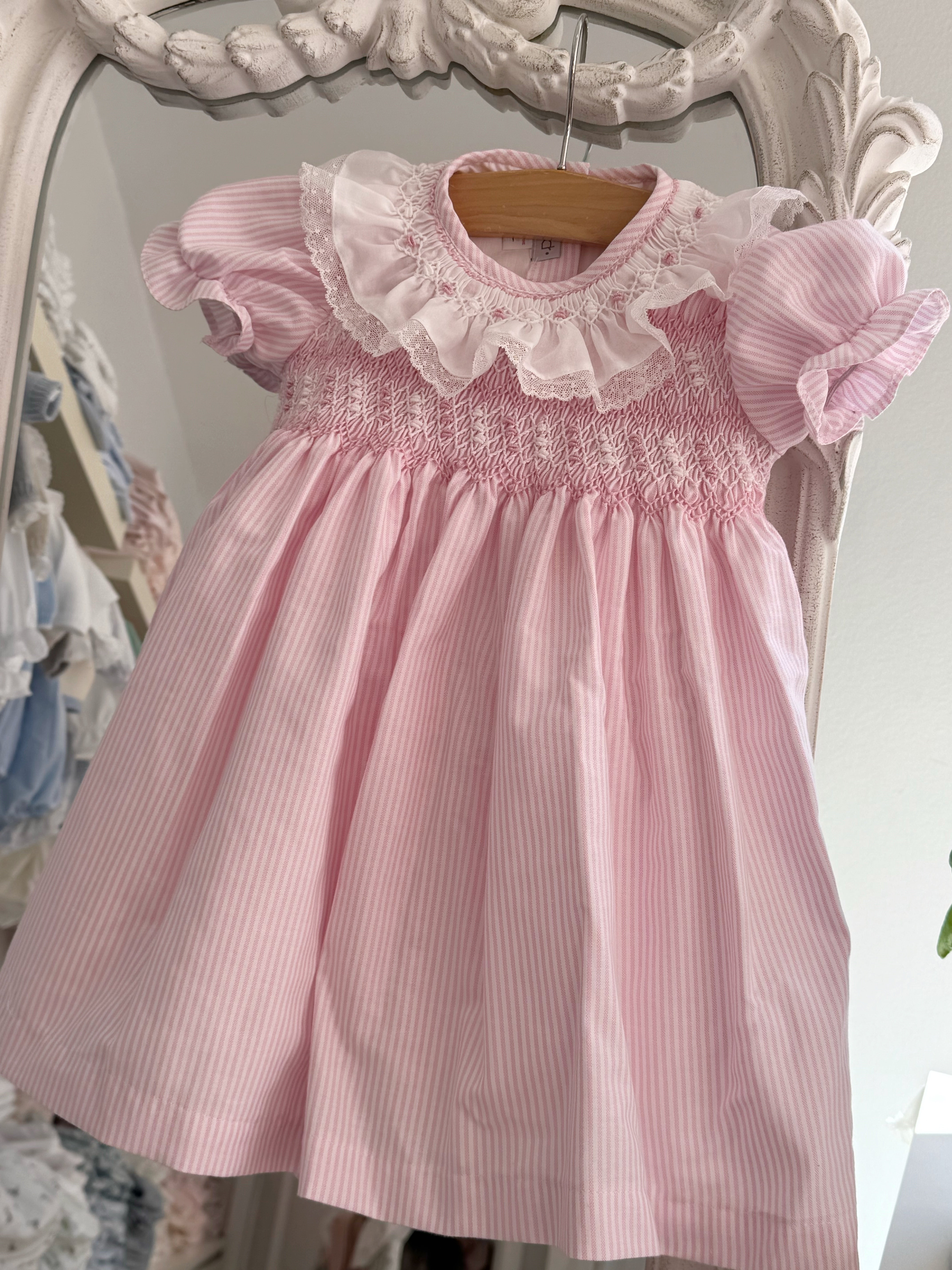 Rosa gestreiftes Smokkleid mit Handstickerei und Schleife auf der Rückseite