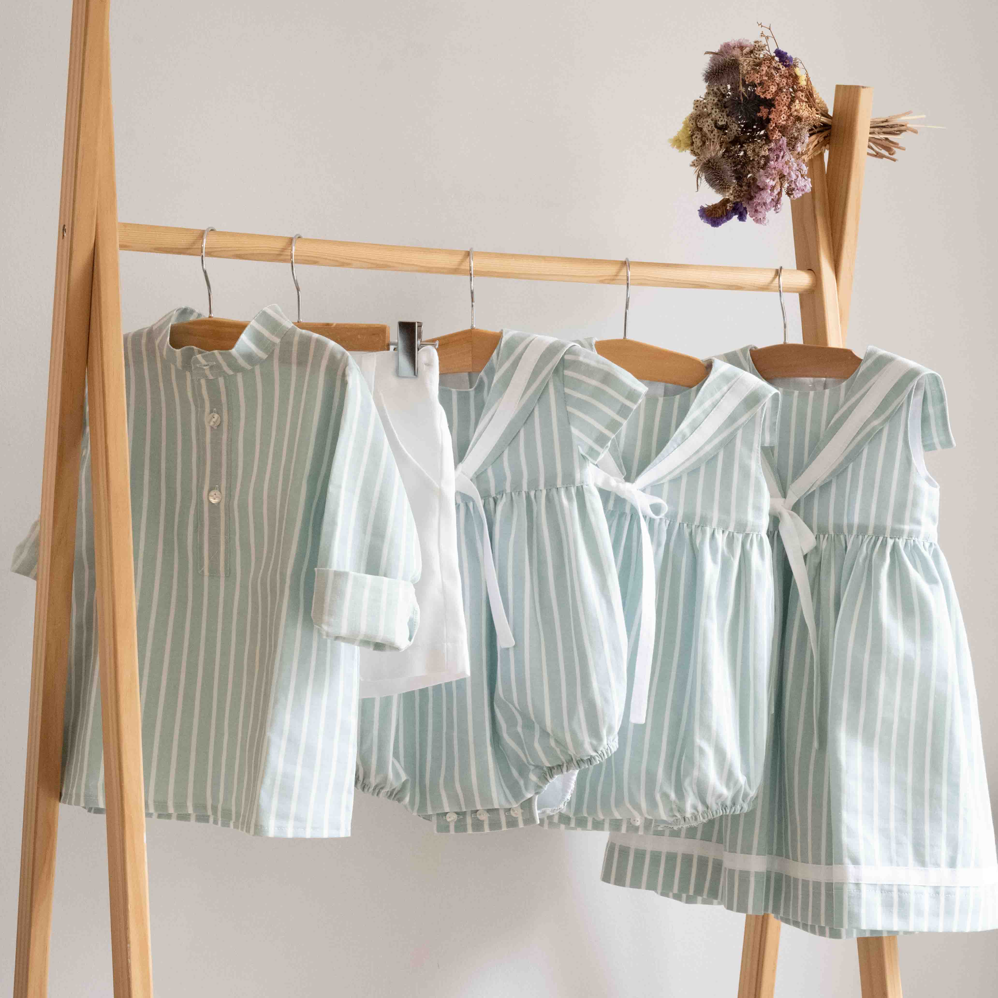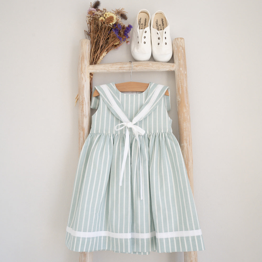 Elegantes Leinenkleid mit grünen und weißen Streifen im Matrosenstil, perfekt für einen frischen und zeitlosen Look. Komplett gefüttert für mehr Komfort. Hergestellt in Portugal