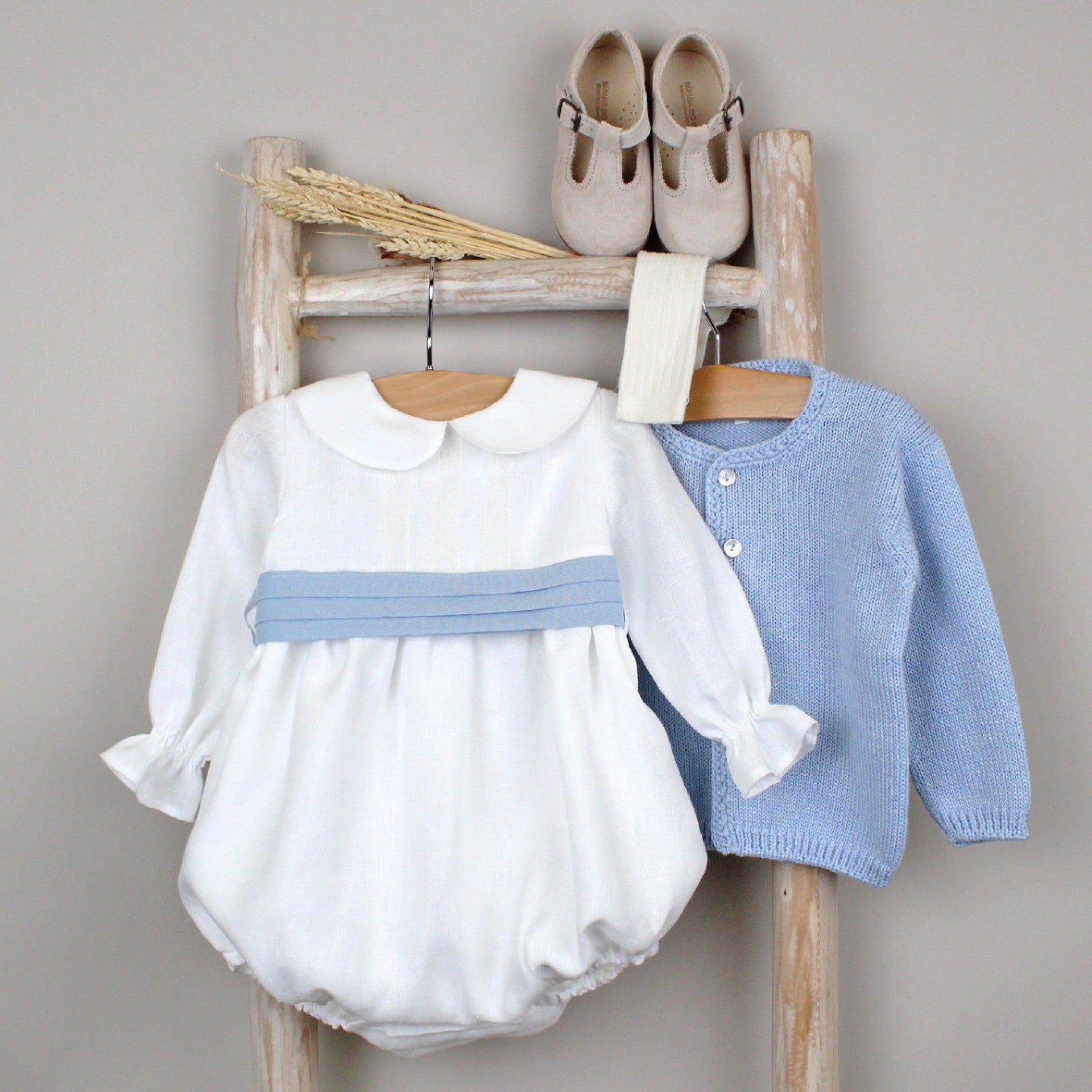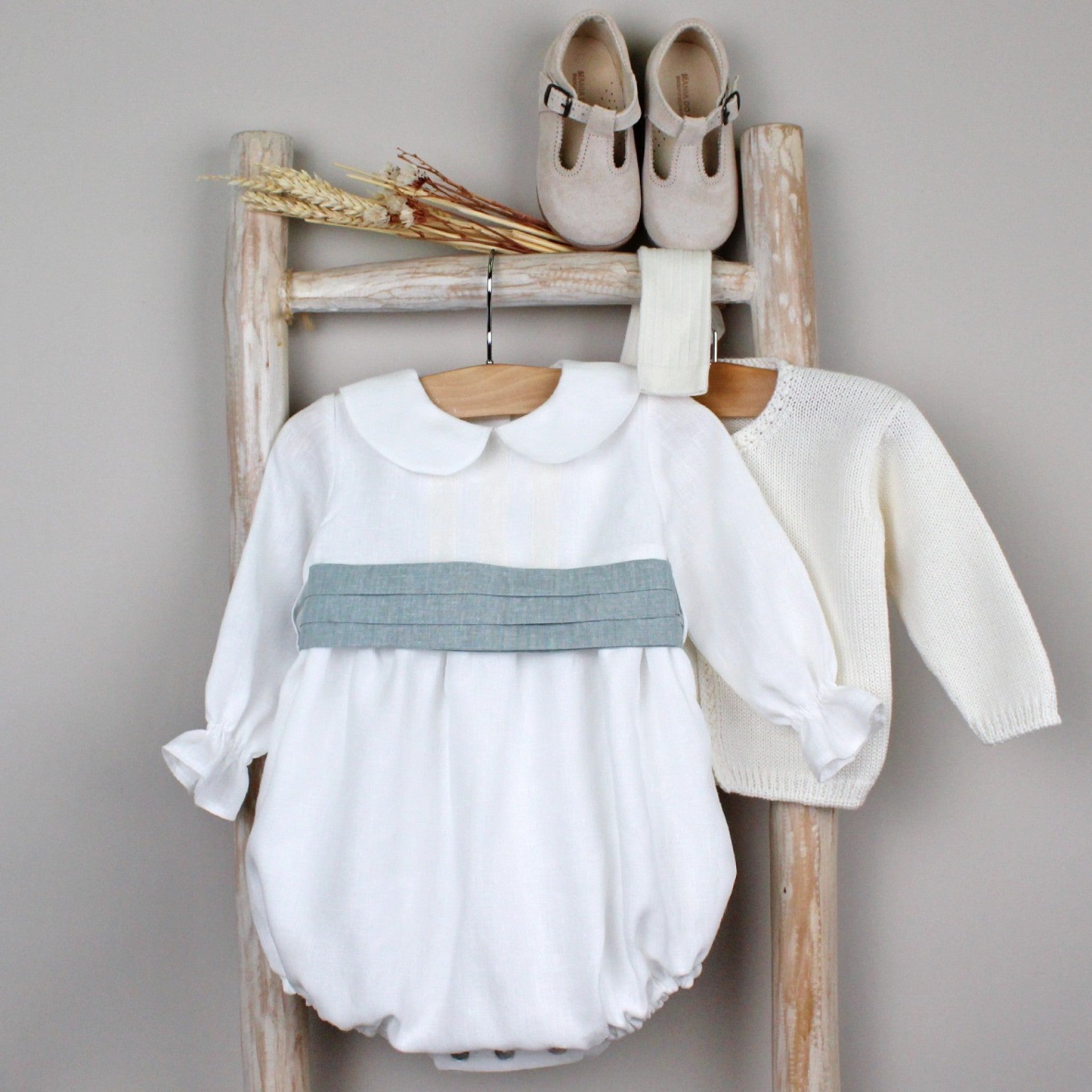 Dieser elegante langärmelige Strampler ist aus leichtem Leinen gefertigt und hat Spitzendetails auf der Brust sowie einen klassischen Peter-Pan-Kragen und einen Taillengürtel für ein raffiniertes Finish. Sein zeitloses Design macht ihn zur perfekten Wahl für besondere Anlässe. Dieser Strampler ist für eine glatte Passform vollständig gefüttert und wird mit Sorgfalt in Portugal hergestellt.