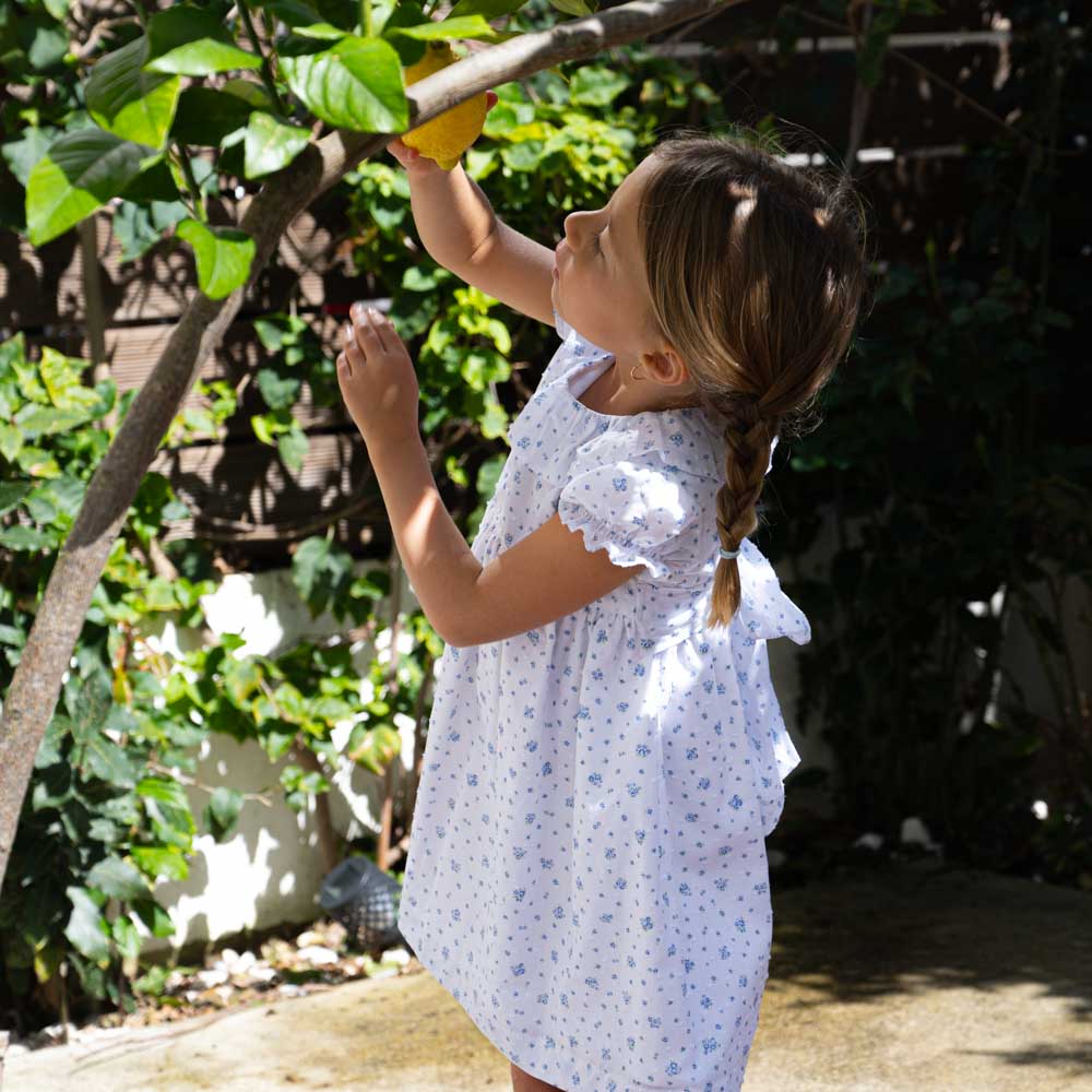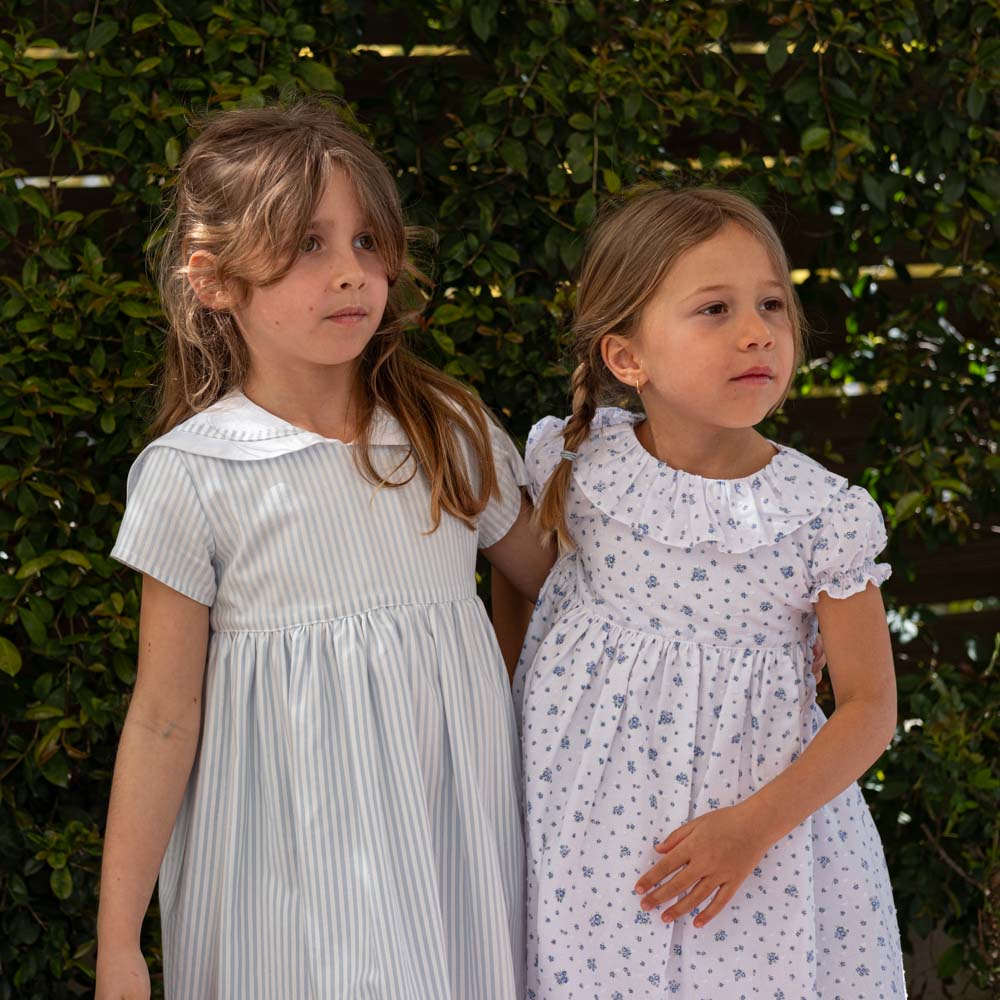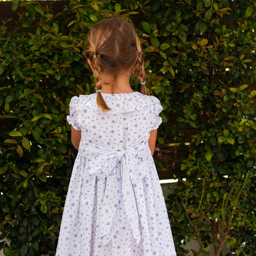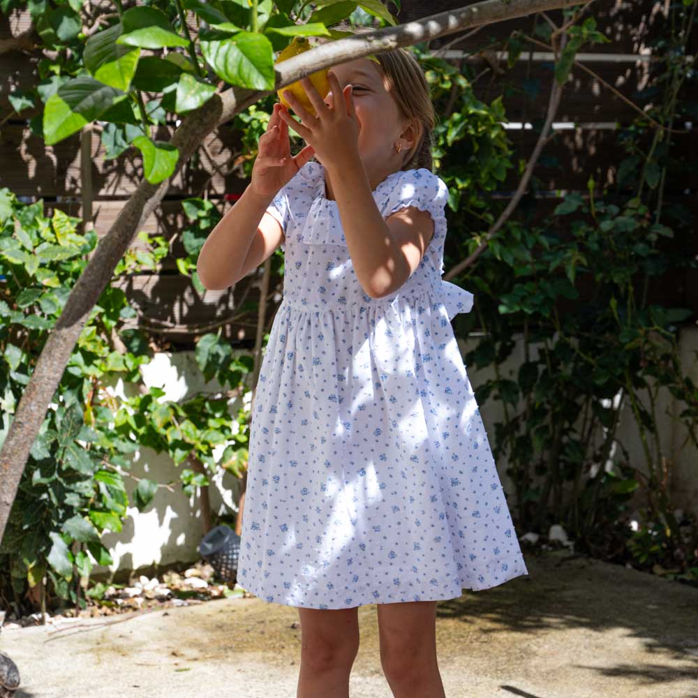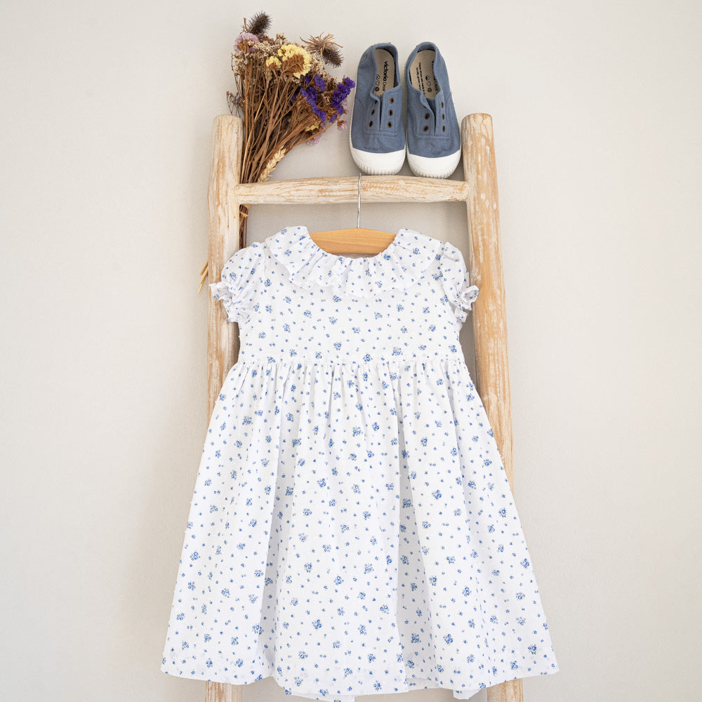 Elegantes Plumeti-Kleid mit kurzen Ärmeln und zartem Blumenmuster in Blautönen. Mit Rüschenkragen, V-Ausschnitt und Schleifenverschluss auf der Rückseite. Komplett gefüttert für Komfort und Stil.