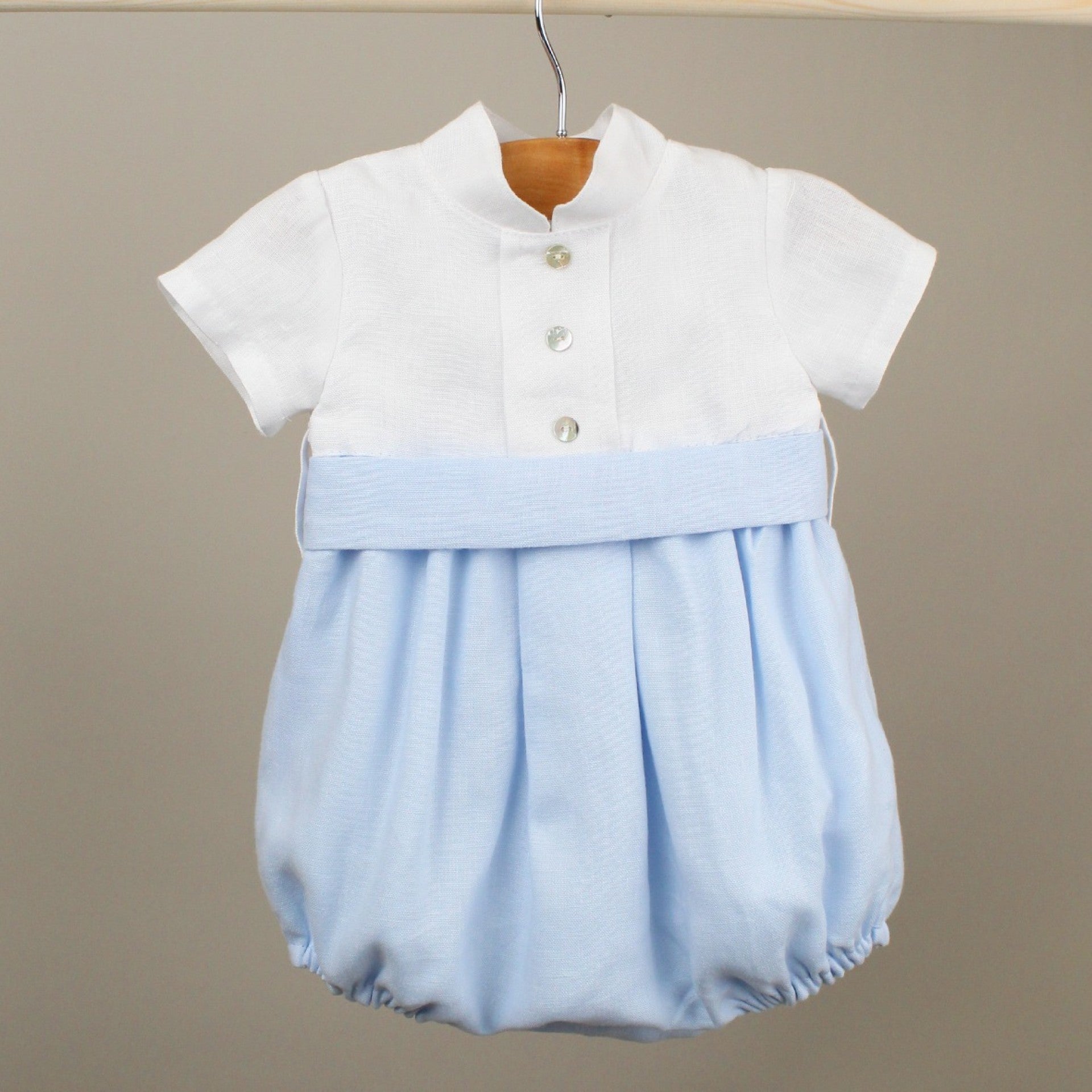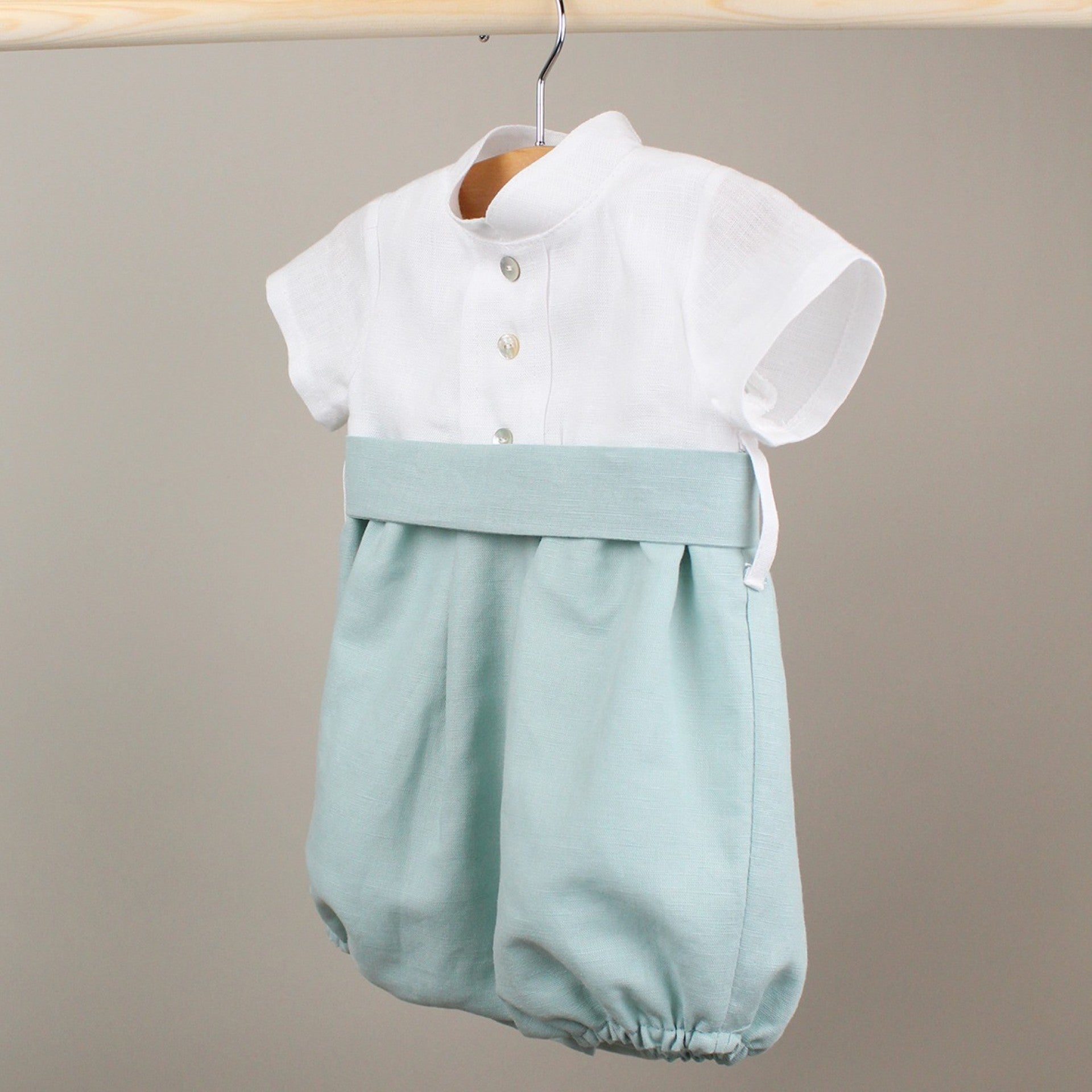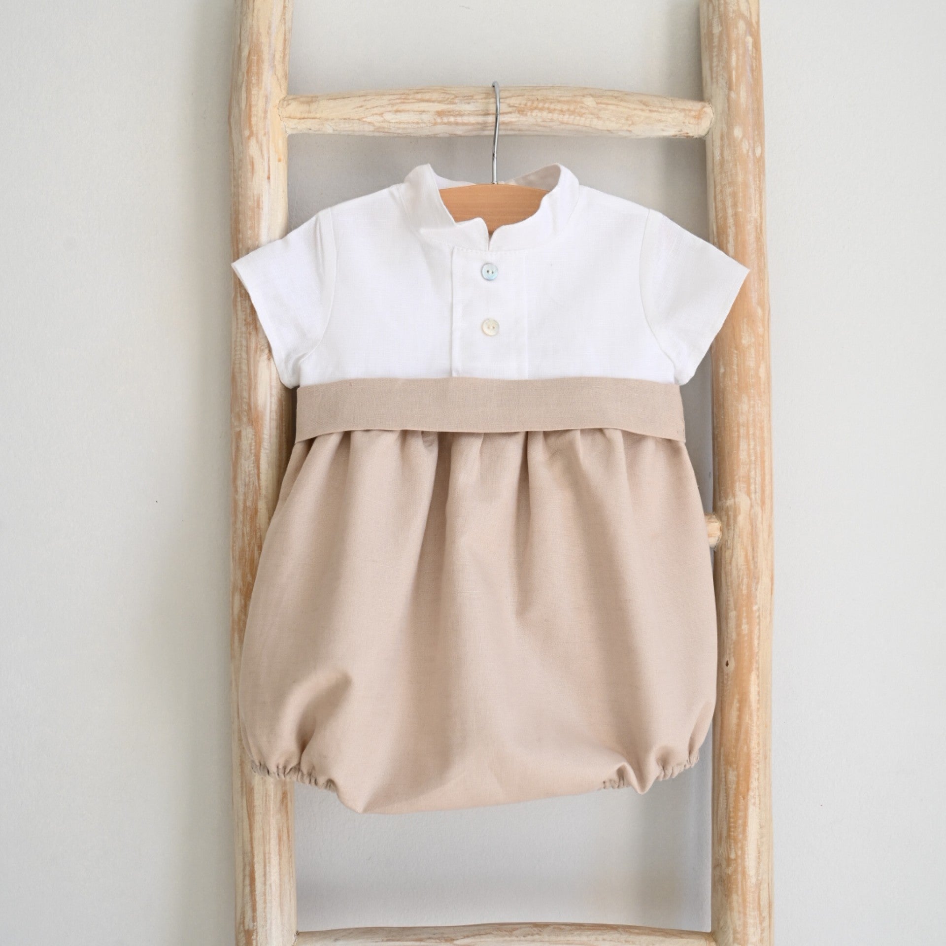 Dieser elegante kurzärmlige Strampler ist aus leichtem Leinen gefertigt und verfügt über einen klassischen Mao-Kragen und einen Taillengürtel für ein raffiniertes Finish. Sein zeitloses Design macht ihn zur perfekten Wahl für besondere Anlässe. Dieser Strampler ist für eine glatte Passform vollständig gefüttert und wird mit Sorgfalt in Portugal hergestellt.