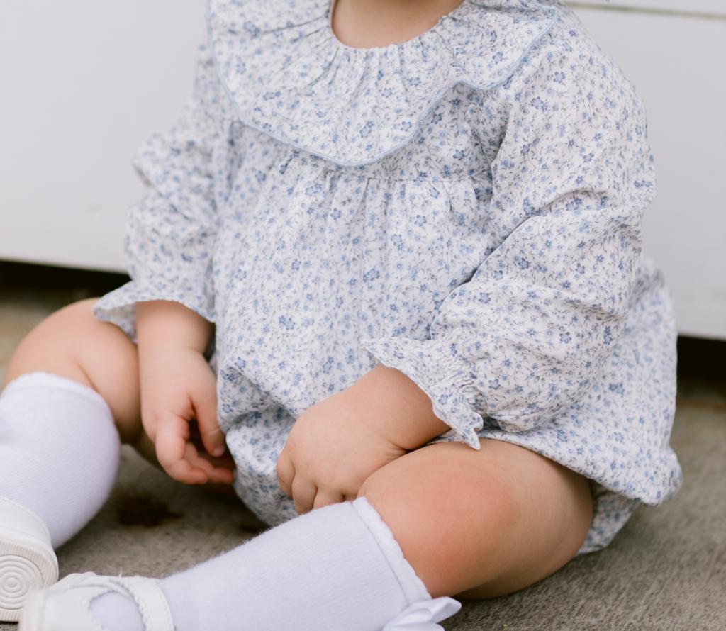 Blue Hand Smocked Romper with Ruffled Collar