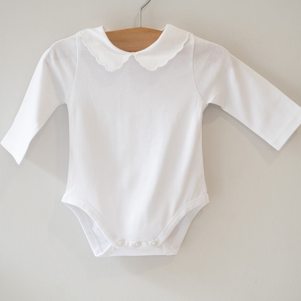 Long-Sleeve Cotton Bodysuit with Embroidered Collar - White