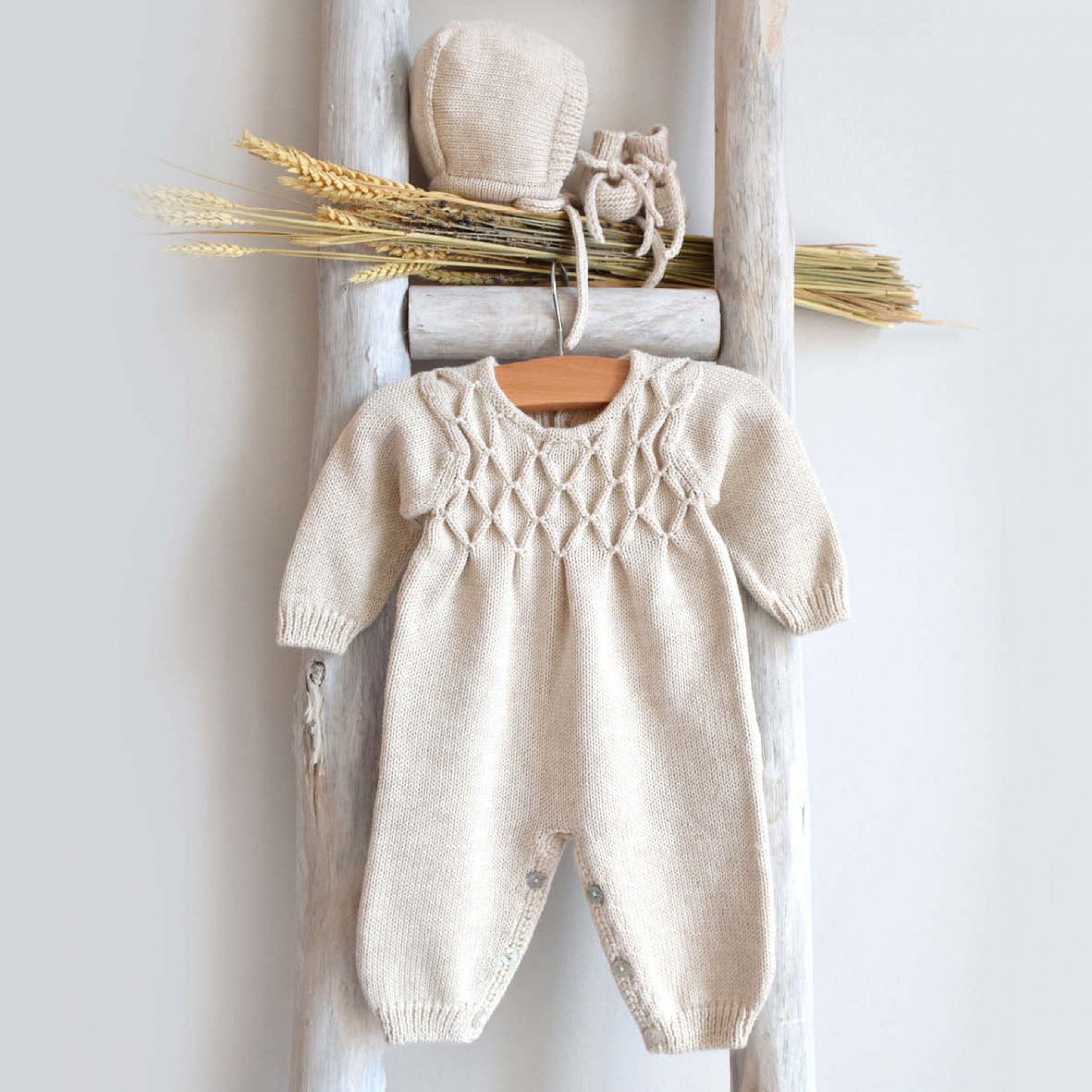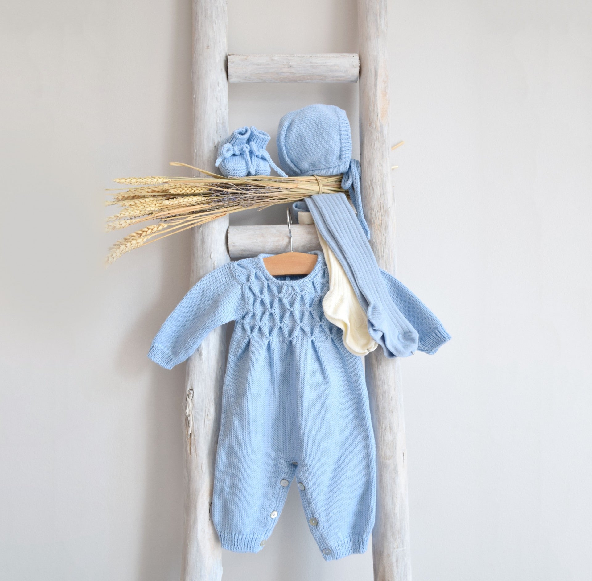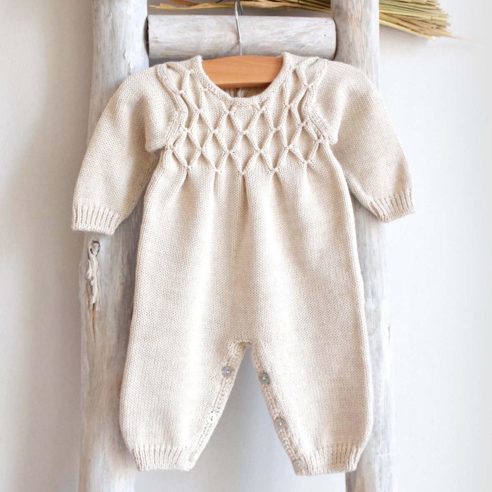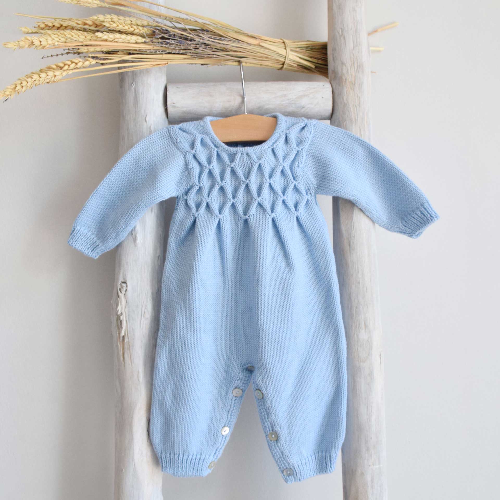 This luxurious long sleeve and legged romper, crafted from soft Italian yarn, offers the perfect blend of warmth and comfort for your little one. The hand-embroidered smock detail on the chest adds a charming, refined touch to this classic piece. Ideal for cooler days, it ensures your baby stays cozy and stylish. For an even more special look, pair it with the matching bonnet and booties from the same collection. Complete the outfit with a shirt with a collar for a timeless, elegant ensemble. Made in Portugal.
