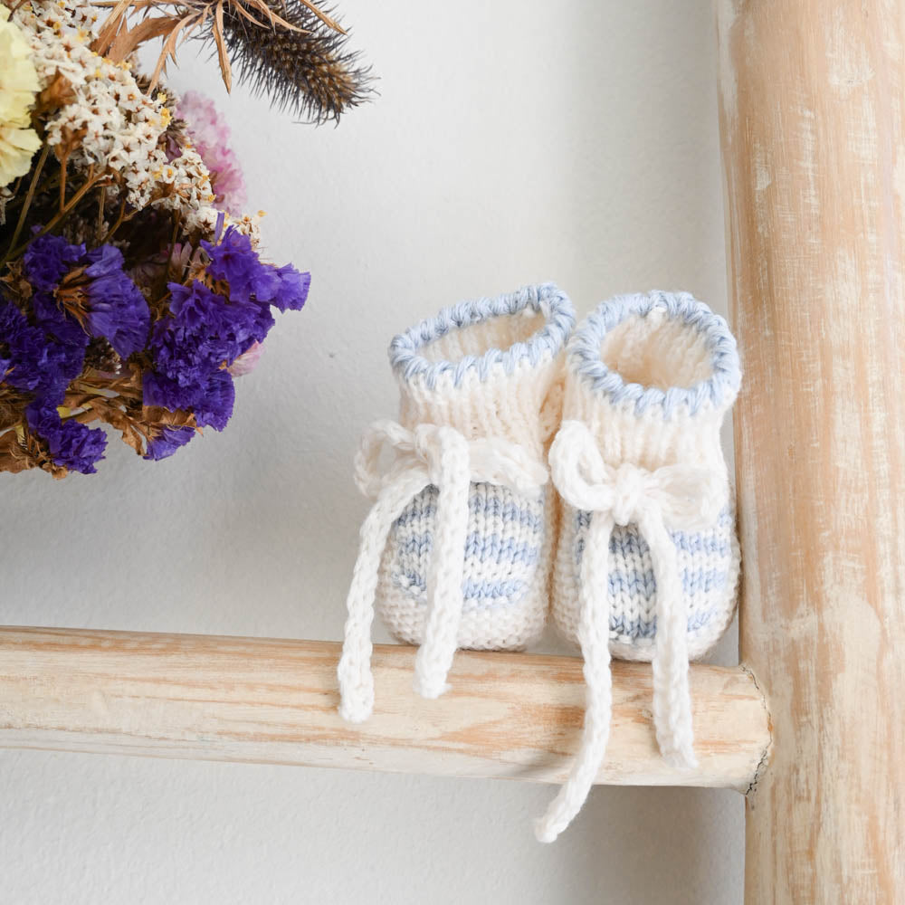 Knitted Cotton Booties with Tie Cord featuring a classic design and a secure tie cord for a snug fit. Perfectly soft and timeless, these booties are ideal for keeping your baby comfortable and stylish.