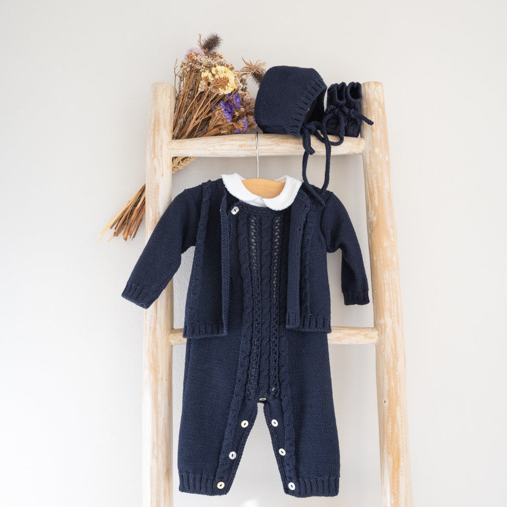 These charming knitted overalls are crafted from soft, high-quality Italian yarn, offering exceptional comfort and warmth. For a complete and adorable look, pair it with the matching bonnet, cardigan and booties from the same collection.Handcrafted in Portugal.