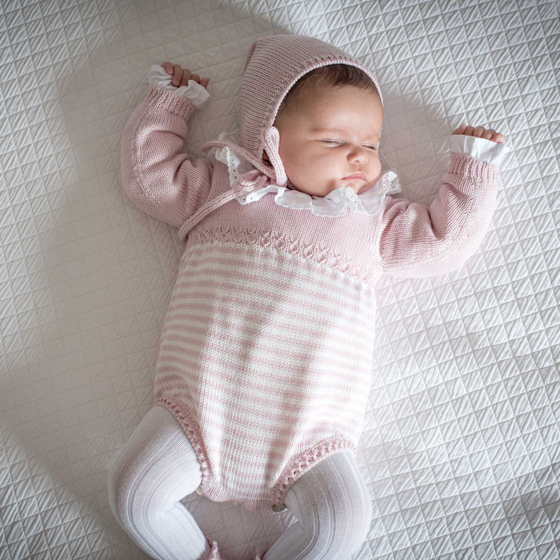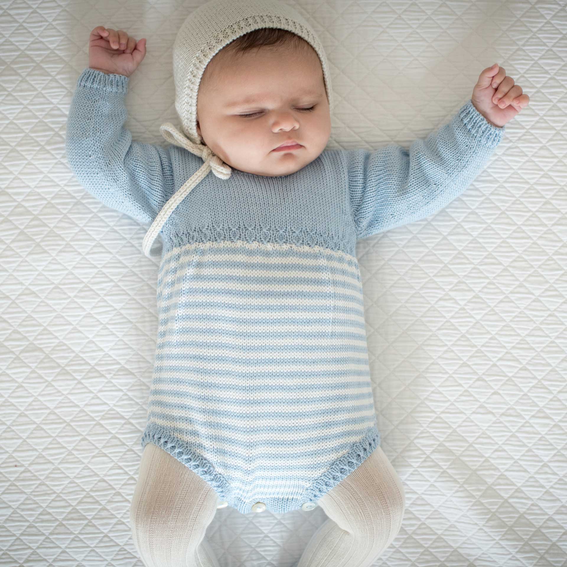 This charming long sleeve romper is crafted from soft, high-quality Italian yarn, offering exceptional comfort and warmth. Featuring elegant handcrafted detailing, it brings a sophisticated touch to the classic striped design. For a complete and adorable look, pair it with the matching bonnet and booties from the same collection. Add a shirt with a collar for an even more refined outfit. This timeless, luxurious combination is perfect for making any occasion extra special. Handcrafted in Portugal.