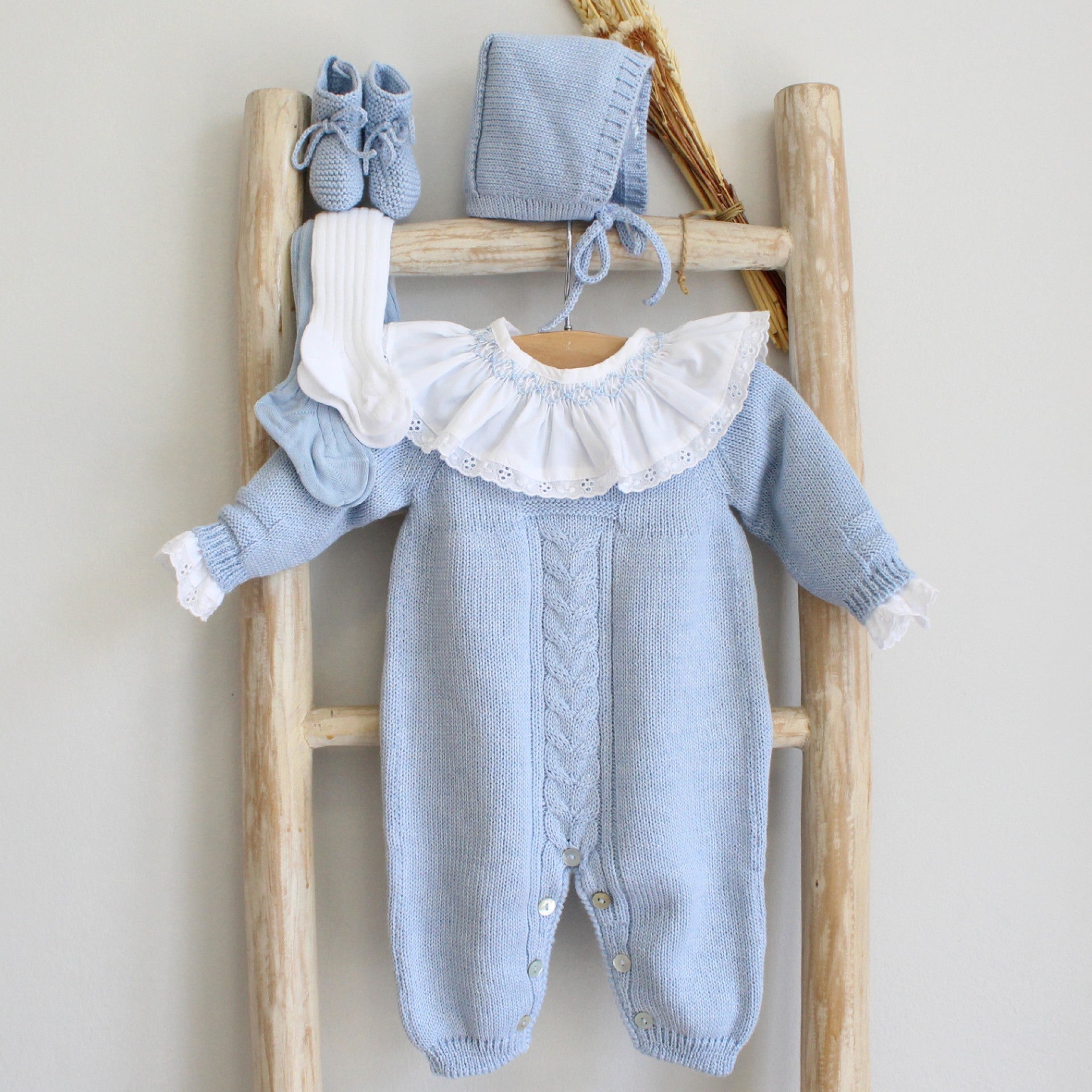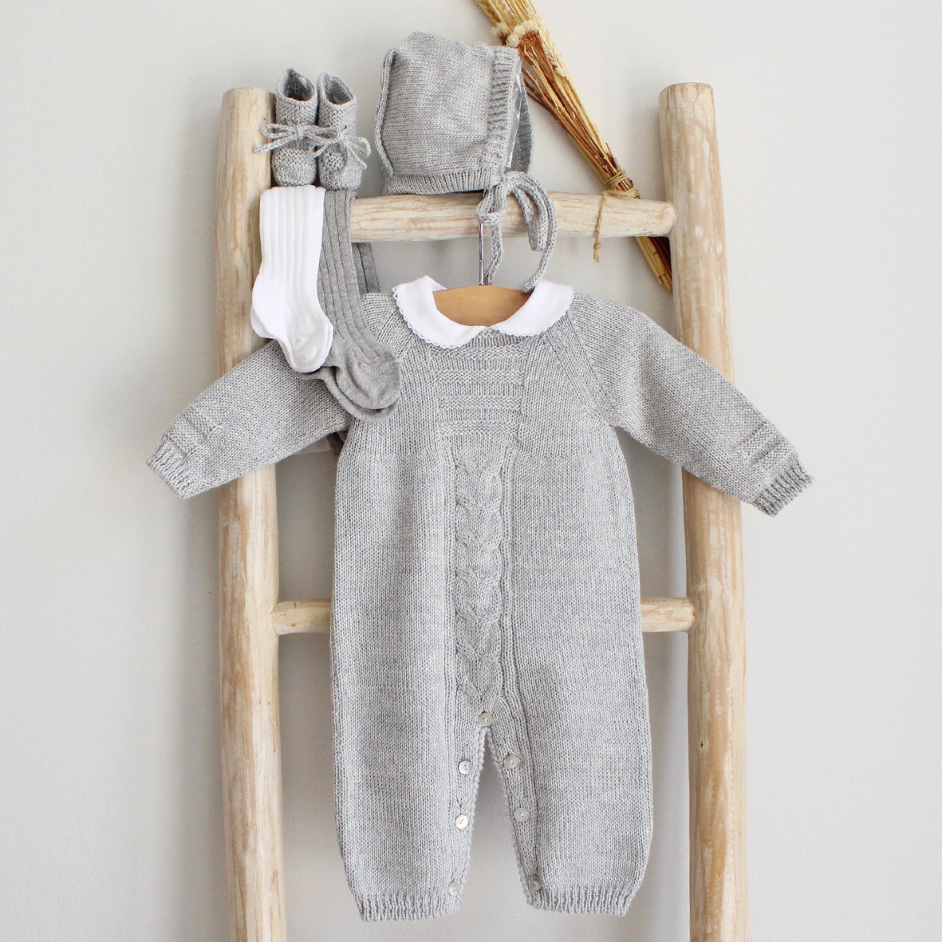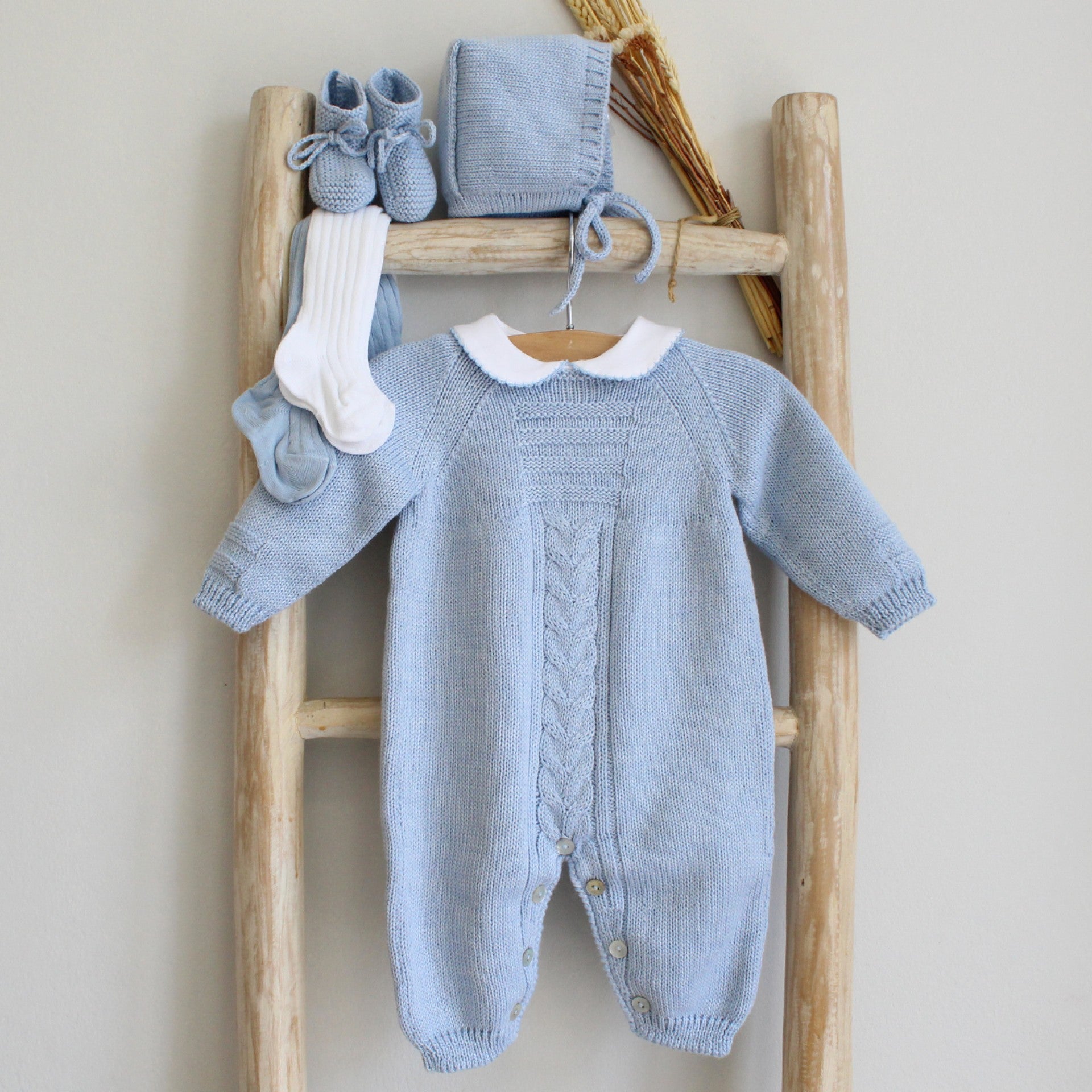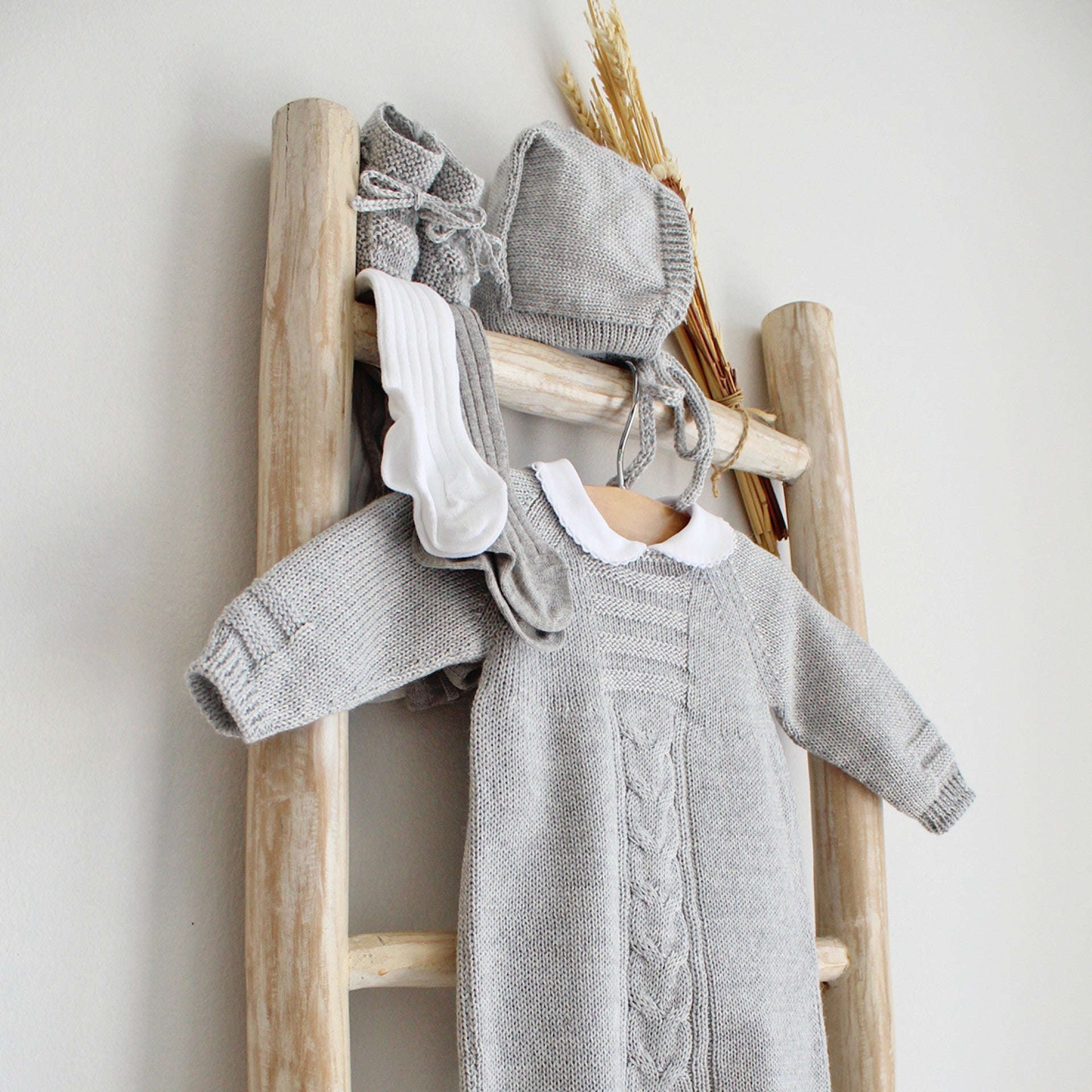 This luxurious long sleeve and legged romper is crafted from soft, high-quality Italian yarn, offering the perfect combination of warmth and comfort for your little one. Featuring beautiful cable detailing on the chest and delicate accents on the sleeves, it adds a refined touch to this timeless piece. Ideal for cooler days, it ensures your baby stays cozy and stylish. For a complete and special look, pair it with the matching bonnet and booties from the same collection. Add a shirt with a collar for an even more elegant ensemble. Made in Portugal