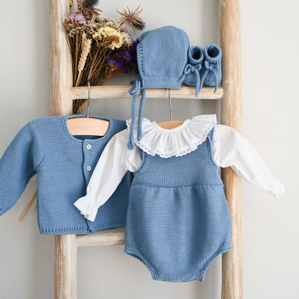 This charming romper is crafted from soft, high-quality Italian yarn, offering exceptional comfort and warmth. Featuring elegant handcrafted detailing, it brings a sophisticated touch to the classic striped design. For a complete and adorable look, pair it with the matching bonnet and booties from the same collection. Add a shirt with a collar for an even more refined outfit. This timeless, luxurious combination is perfect for making any occasion extra special. Handcrafted in Portugal.