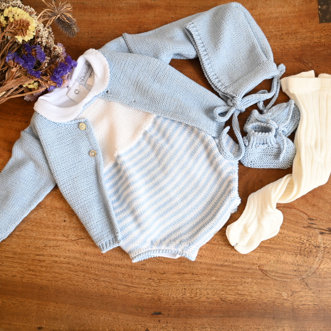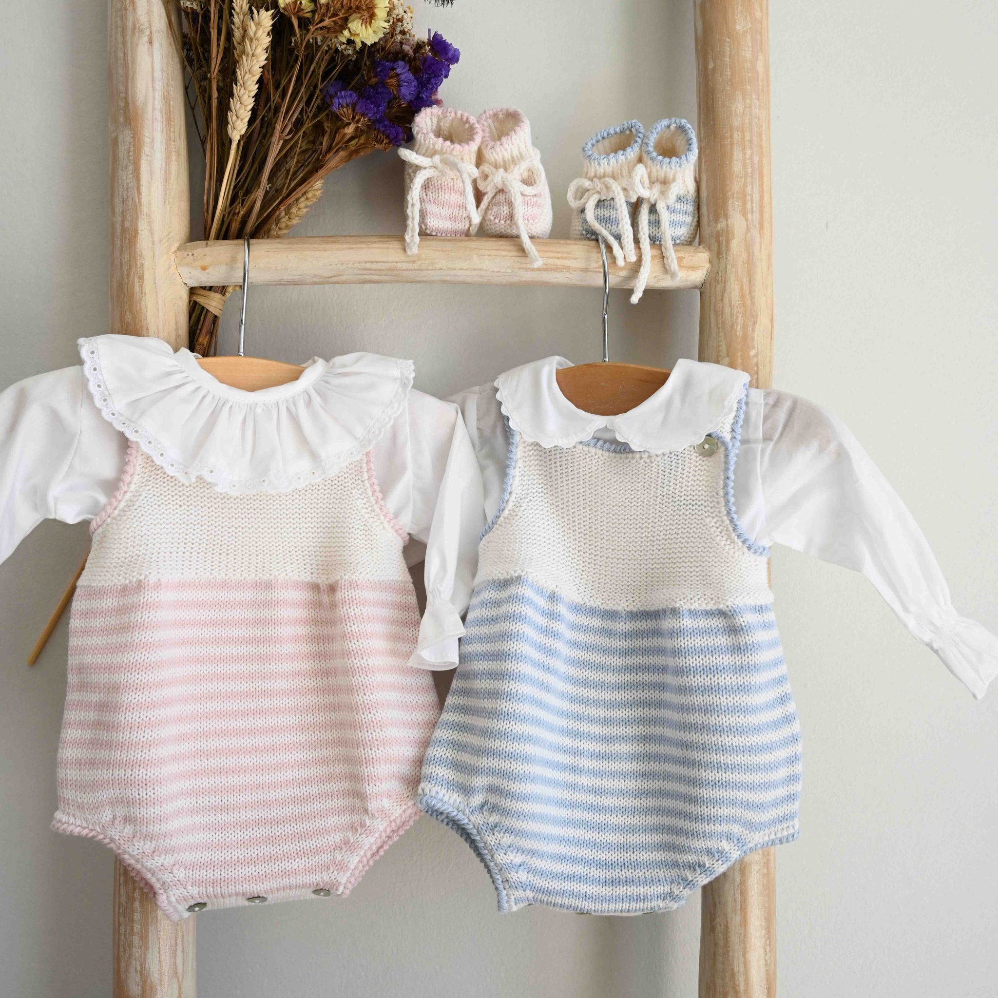 This charming romper is crafted from soft, high-quality Italian yarn, offering exceptional comfort and warmth. Featuring elegant handcrafted detailing, it brings a sophisticated touch to the classic striped design. For a complete and adorable look, pair it with the matching bonnet and booties from the same collection. Add a shirt with a collar for an even more refined outfit. Handcrafted in Portugal.
