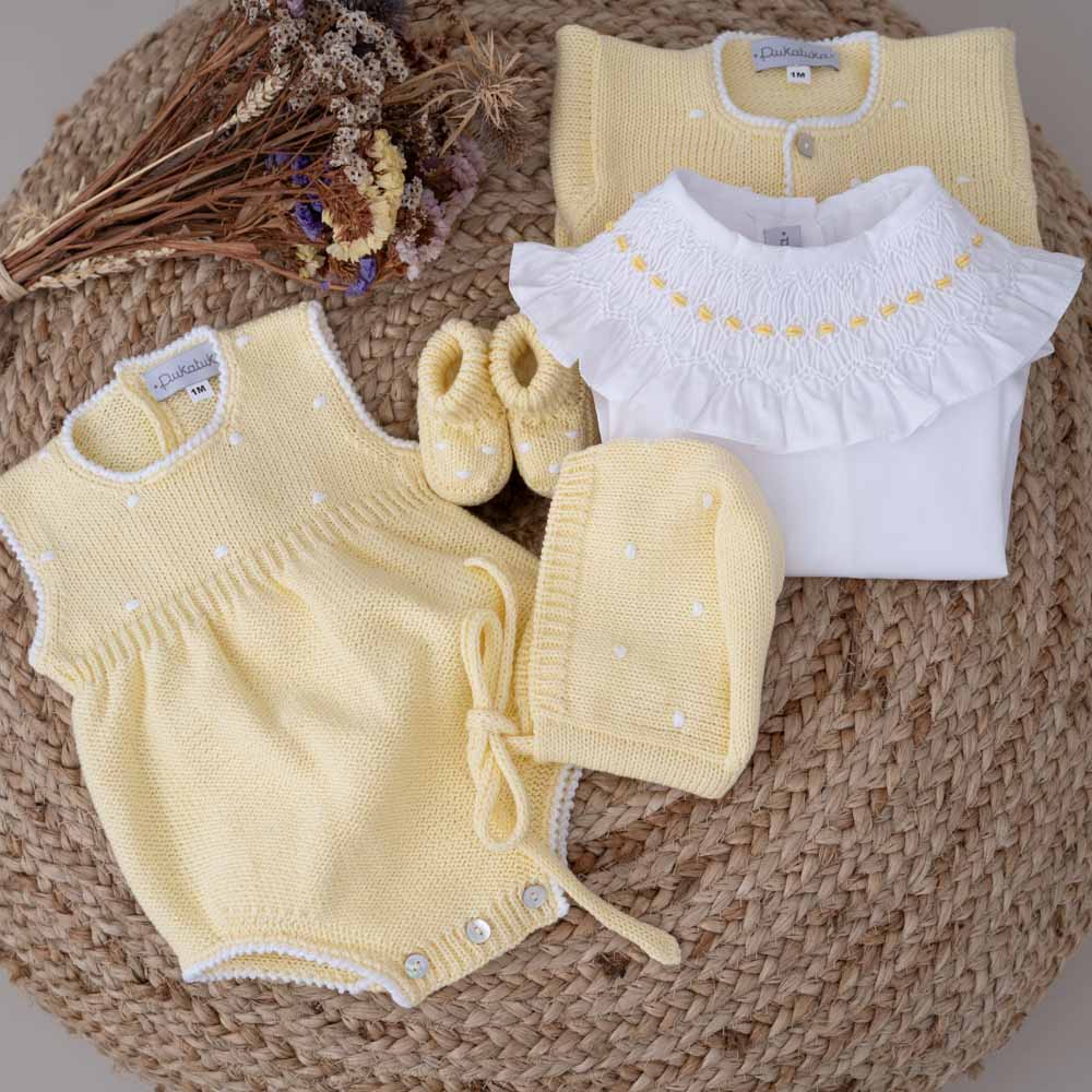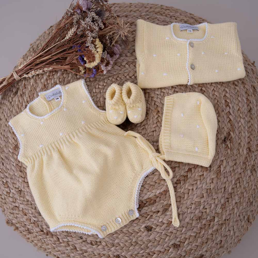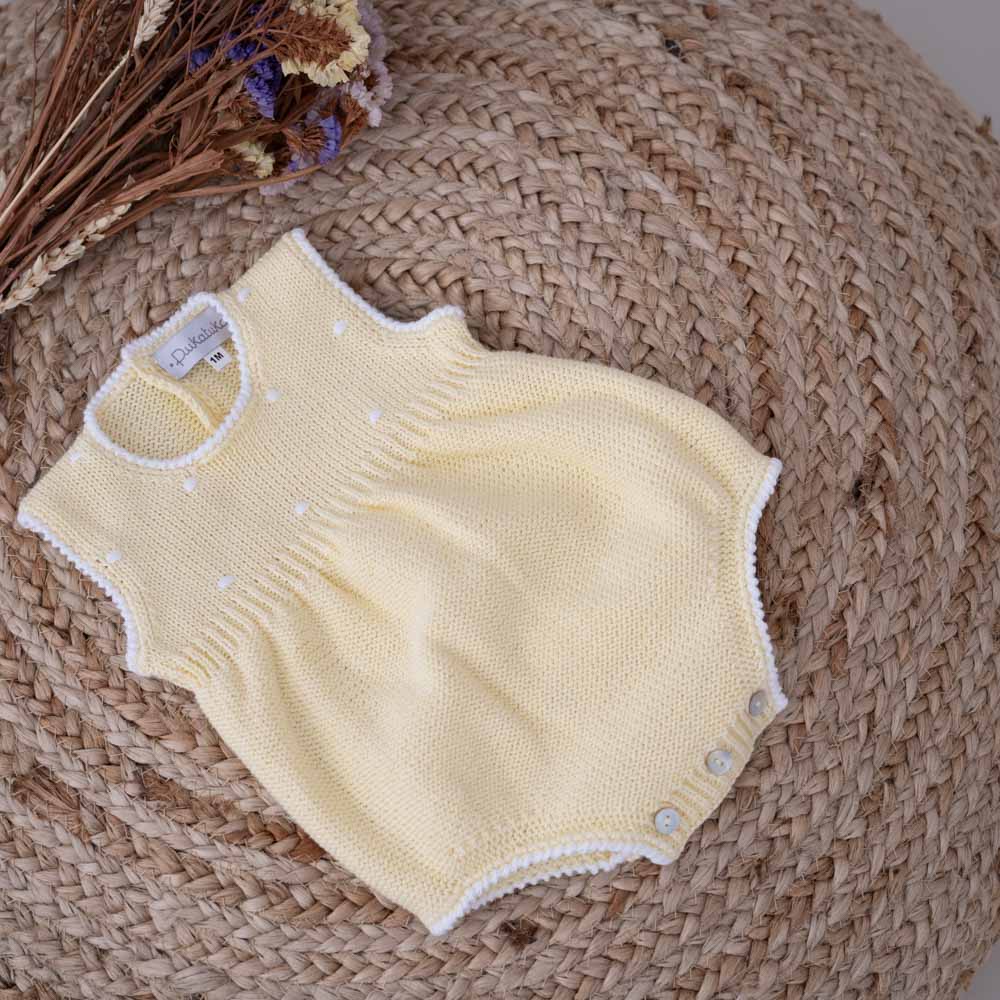 Yellow Knitted Cotton Romper with Hand-Embroidered Dots