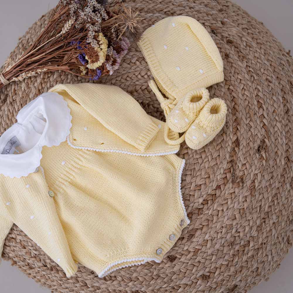 This high-quality knitted cotton romper features delicate hand-embroidered polka dots and contrasting trims on the legs and arms. Crafted from 100% premium Italian yarn, it offers exceptional softness and durability. Perfect for comfortable, stylish days—produced with care in Portugal. Complete the look with our matching cardigan, bonnet, and booties from the same collection for the perfect outfit. For an even more stylish ensemble, you can add a shirt or bodysuit with a collar to create a look that's even more charming and polished.