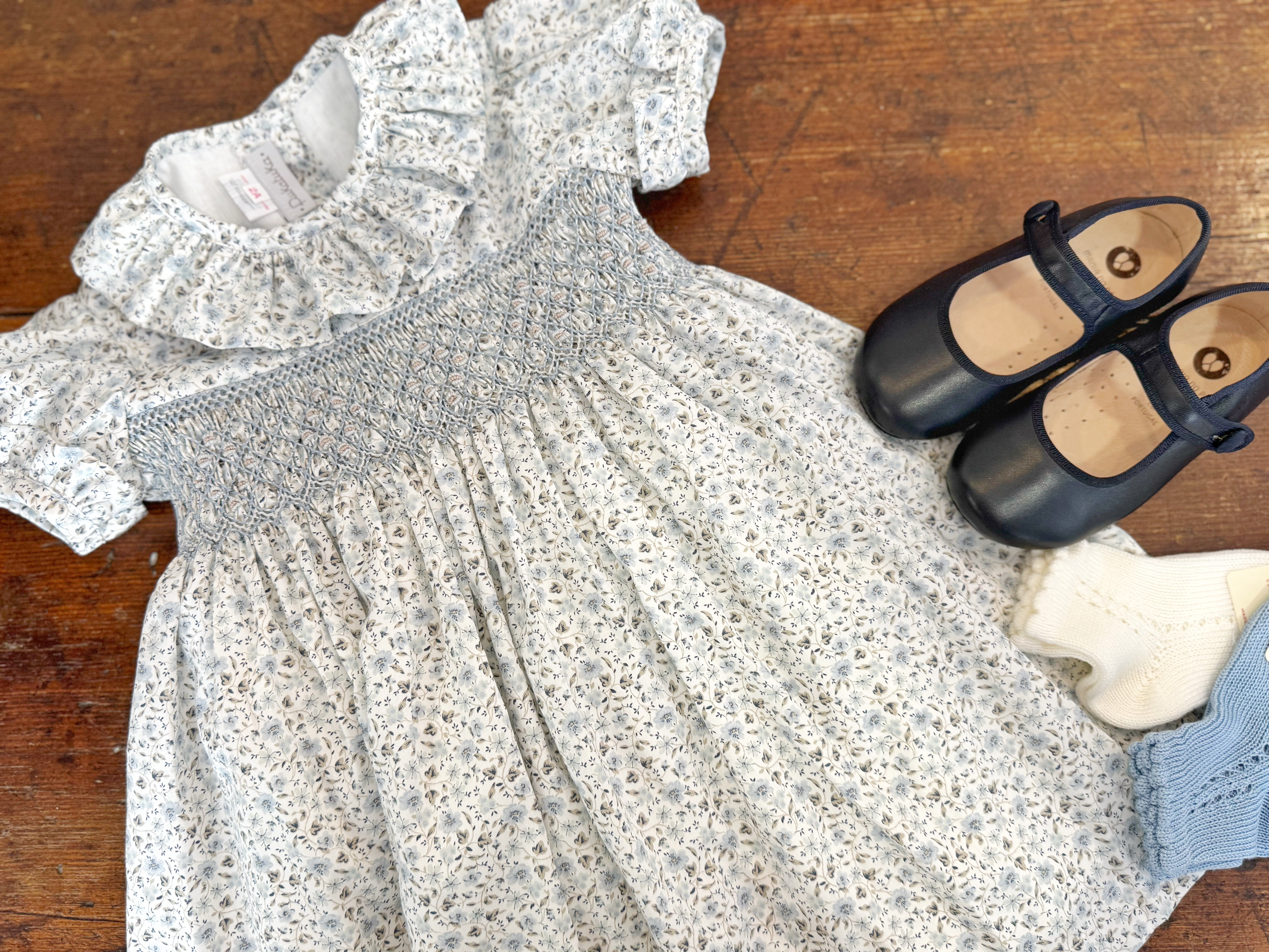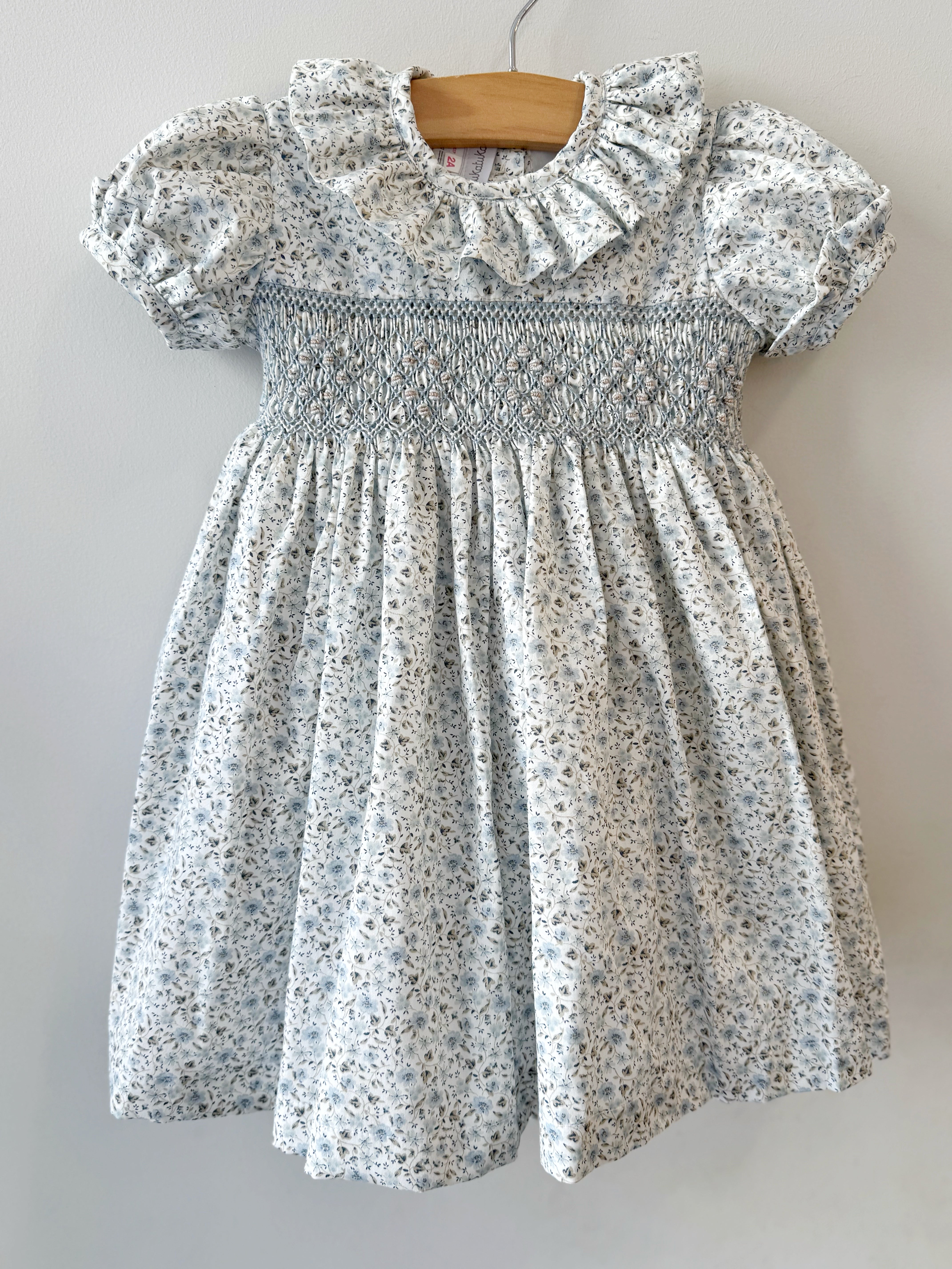 Elegant dress in a floral fabric with a hand-embroidered smocked bodice and frilled collar. Fully lined for comfort, featuring a tie-back belt for a perfect fit. Made in Portugal. 100% cotton
