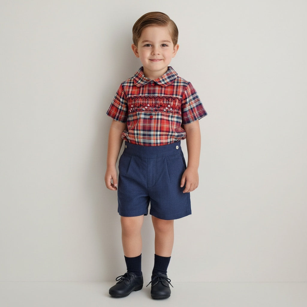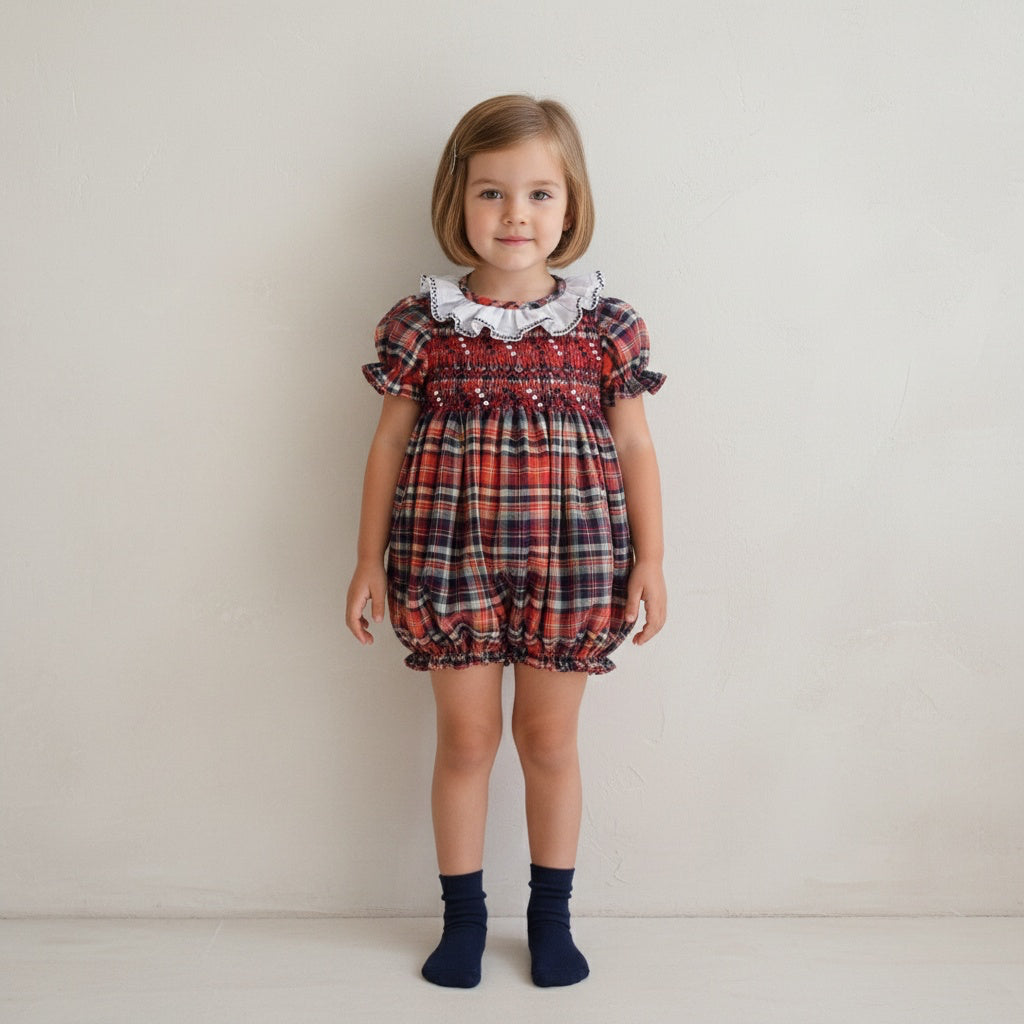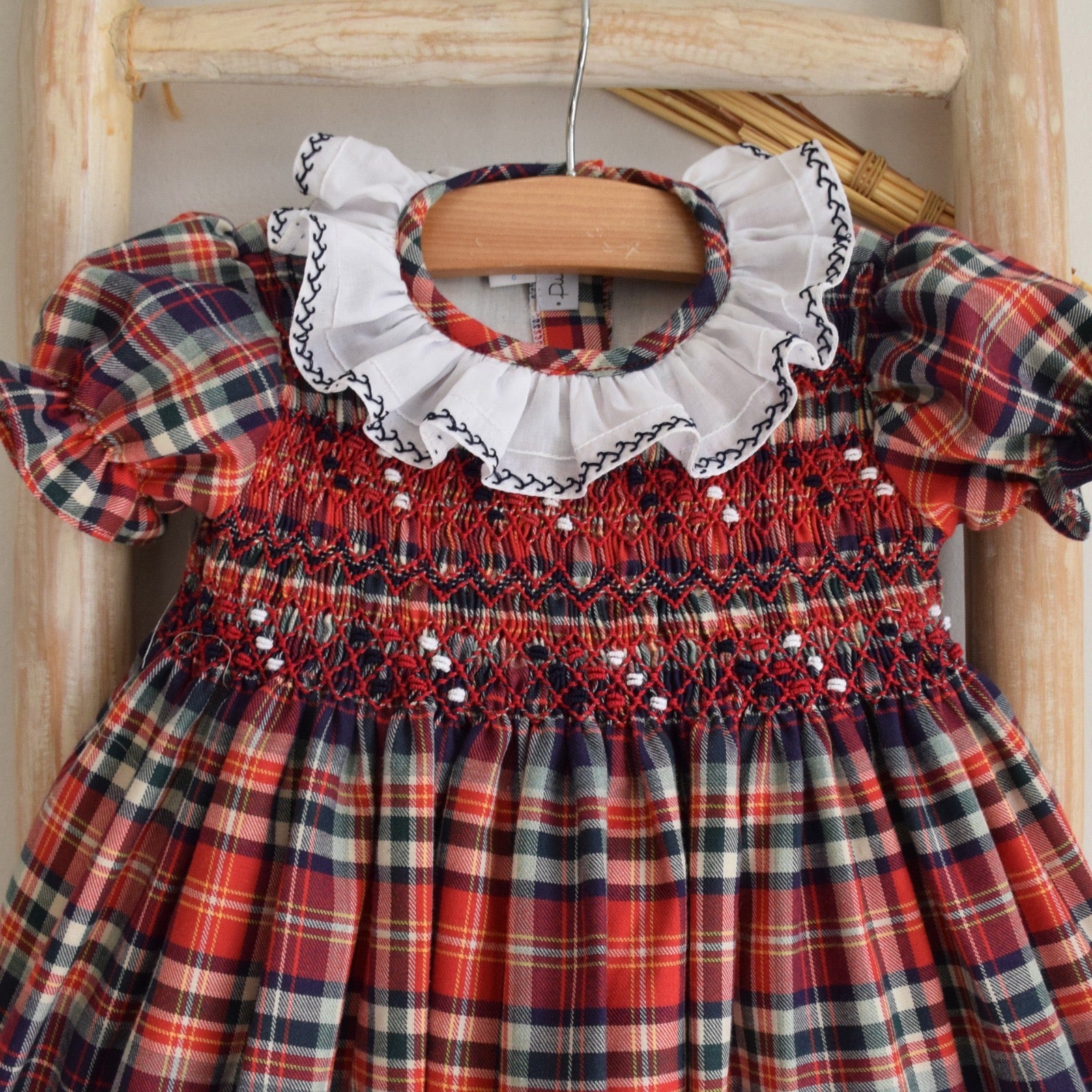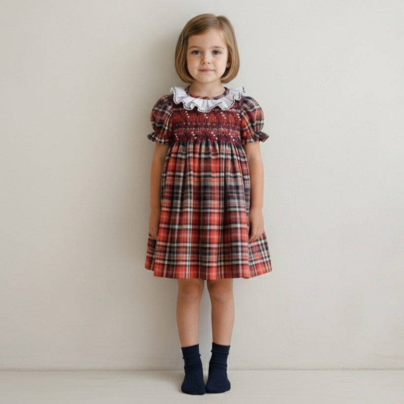 Elegant dress in a burgundy and navy plaid with a hand-embroidered smocked bodice and frilled collar with delicate hand embroidery. Fully lined for comfort, featuring a tie-back belt for a perfect fit. Made in Portugal.