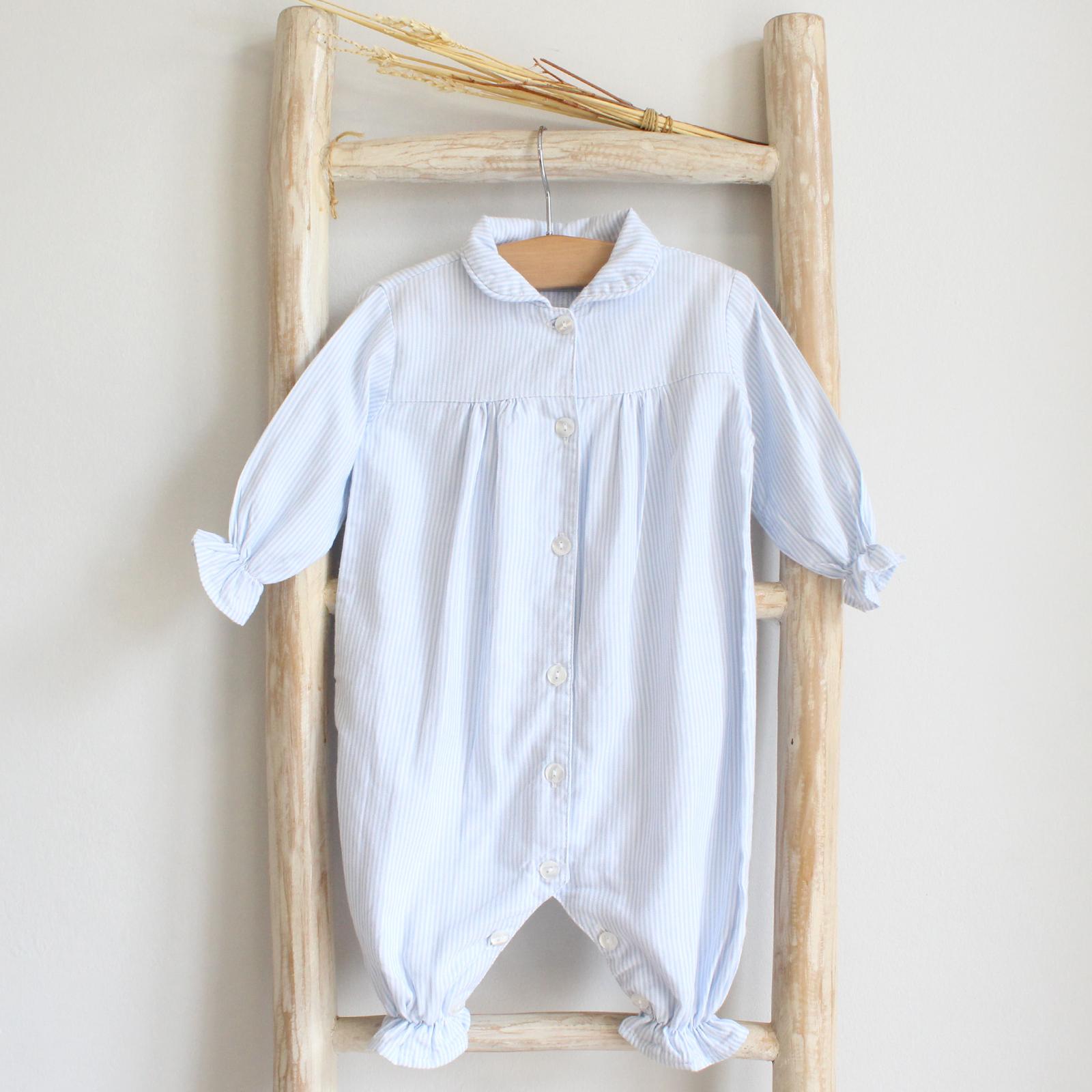 Our cotton Baby Pajamas feature  a delicate Peter Pan collar for an extra touch of sweetness and blue stripes. Soft and comfortable, it’s perfect for keeping your little one snug and stylish during sleep or play. Made in Portugal