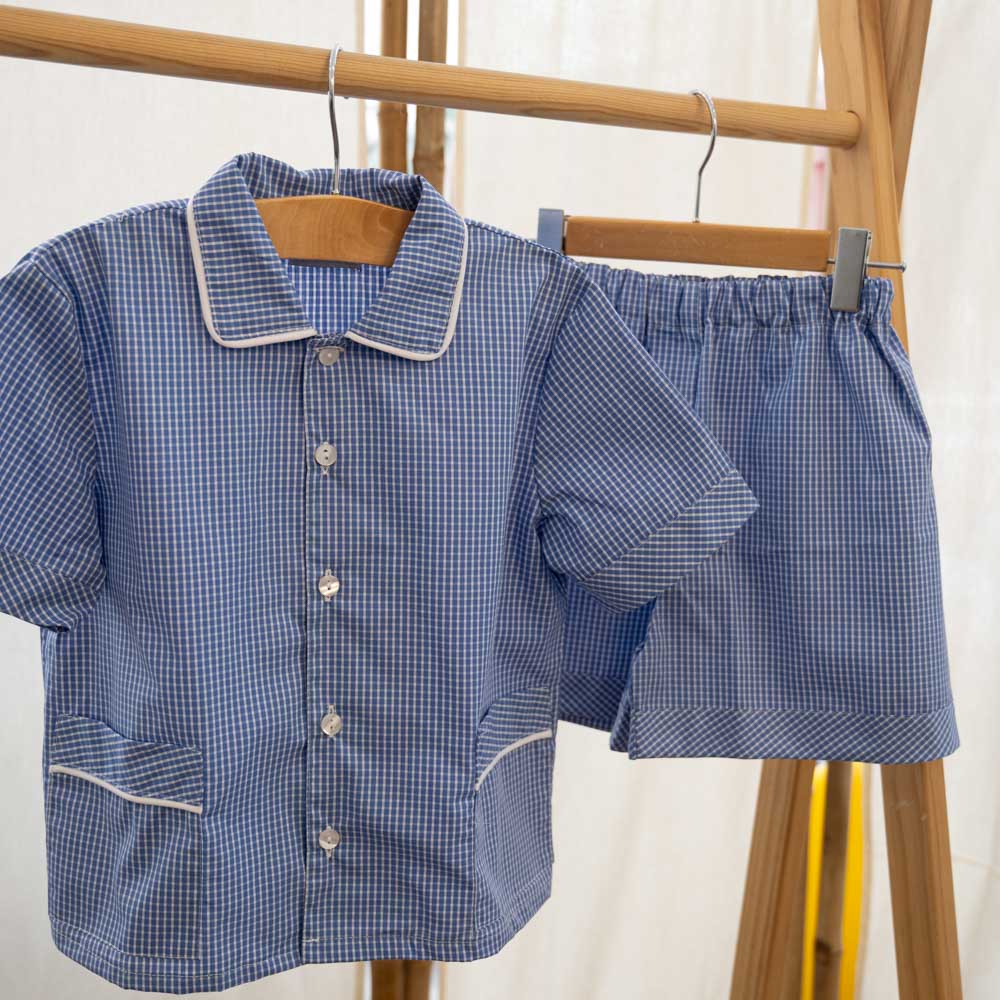 This classic-cut pajama set is designed for comfort and timeless style. Made from soft, cotton, it features short sleeves and shorts. Produced in a blue Vichy pattern with white trims details. Made in Portugal