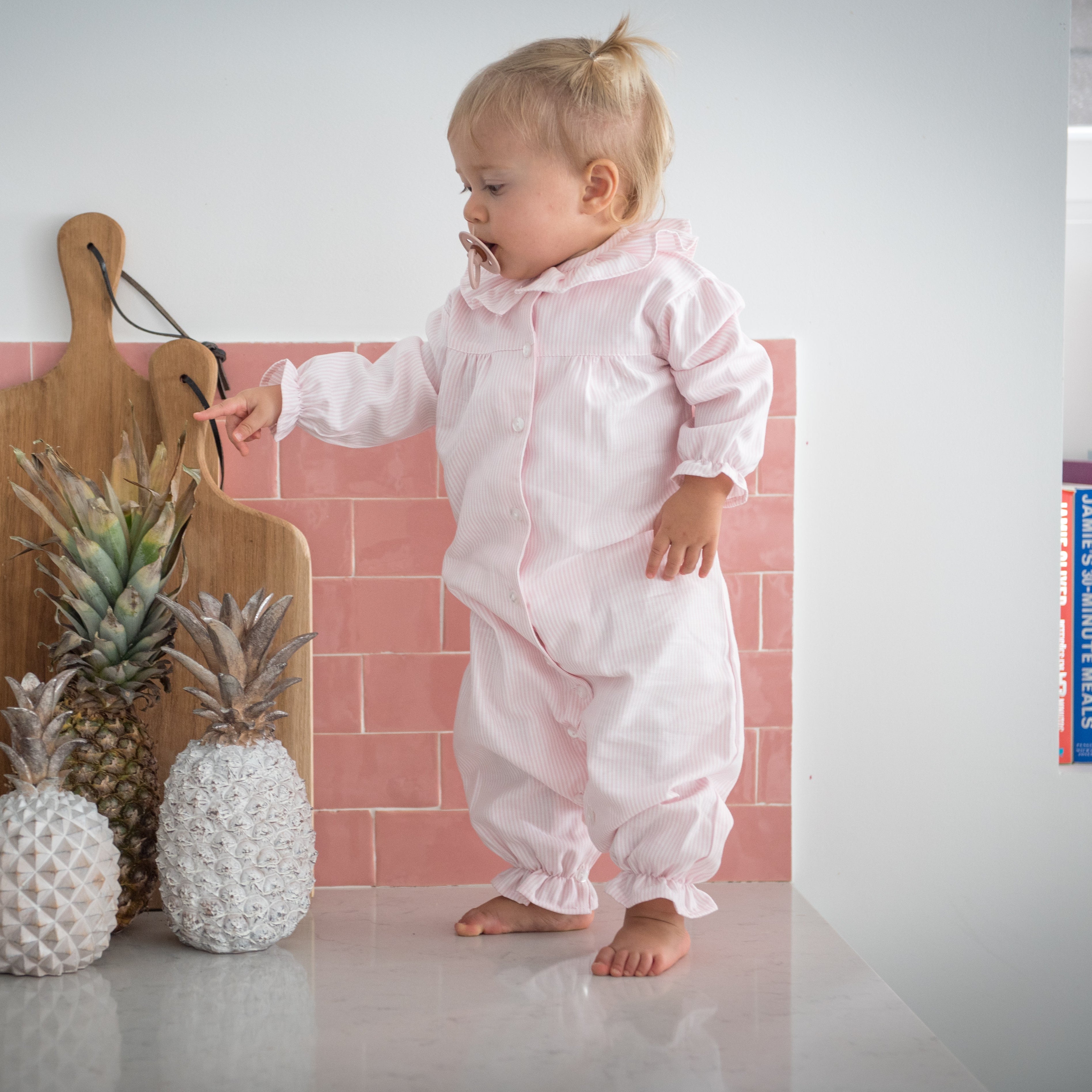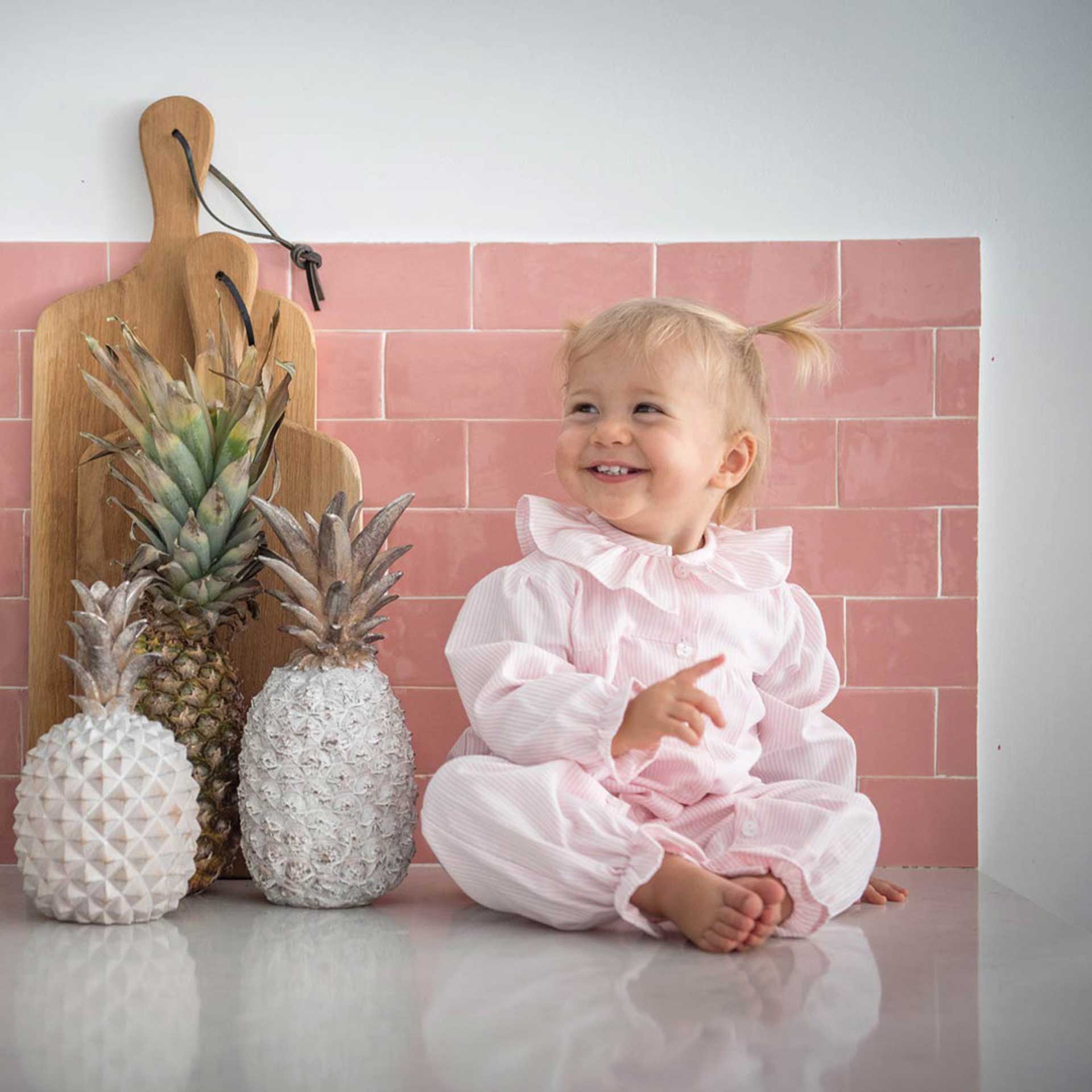 Our cotton Baby Pajamas feature a charming pink stripe pattern and a delicate ruffle collar for an extra touch of sweetness. Soft and comfortable, it’s perfect for keeping your little one snug and stylish during sleep or play. Made in Portugal