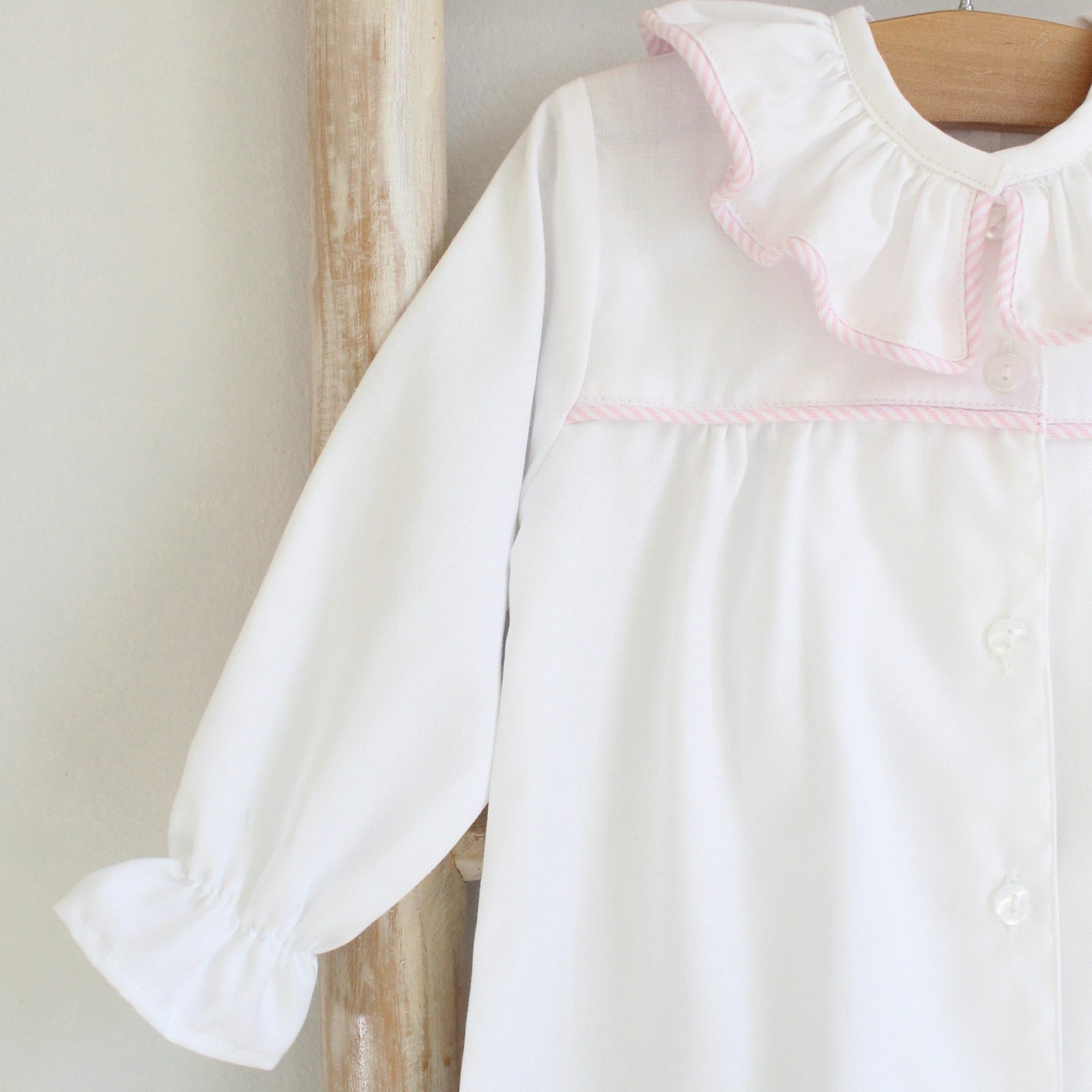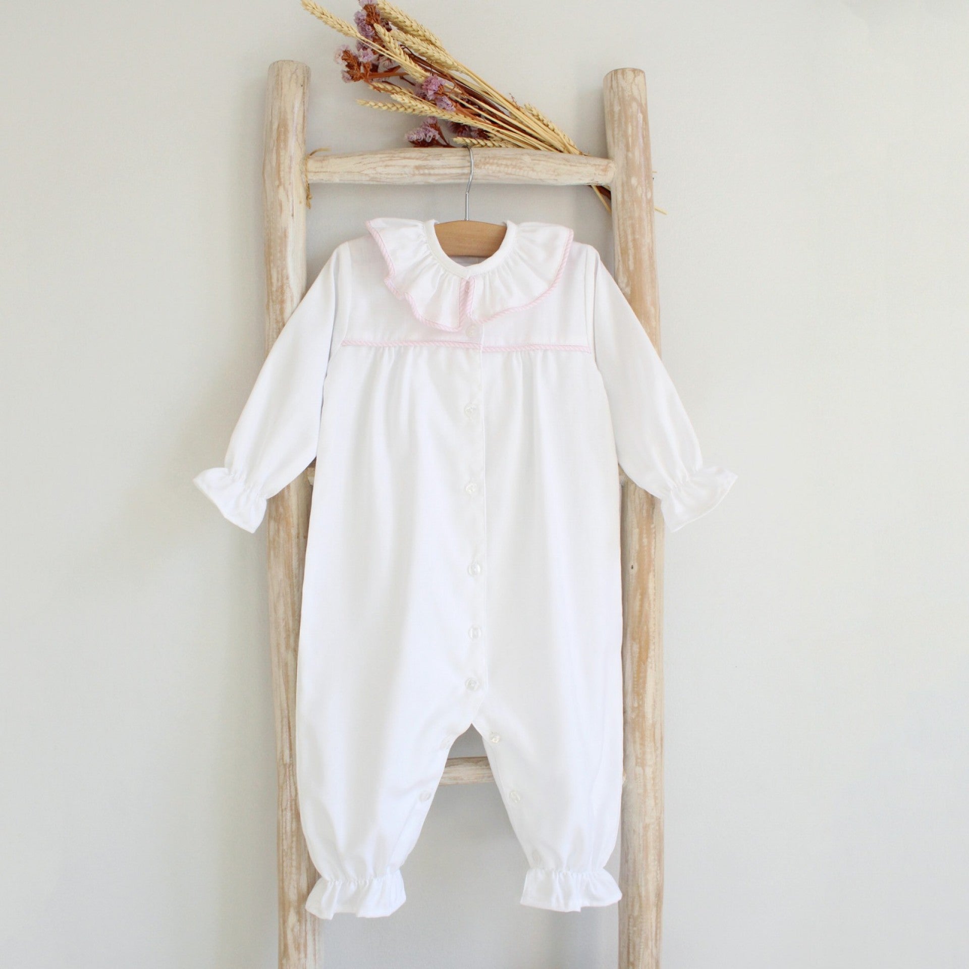 Our cotton Baby Pajamas feature a charming pink stripe trim on chest and a delicate ruffle collar for an extra touch of sweetness. Soft and comfortable, it’s perfect for keeping your little one snug and stylish during sleep or play. Made in Portugal