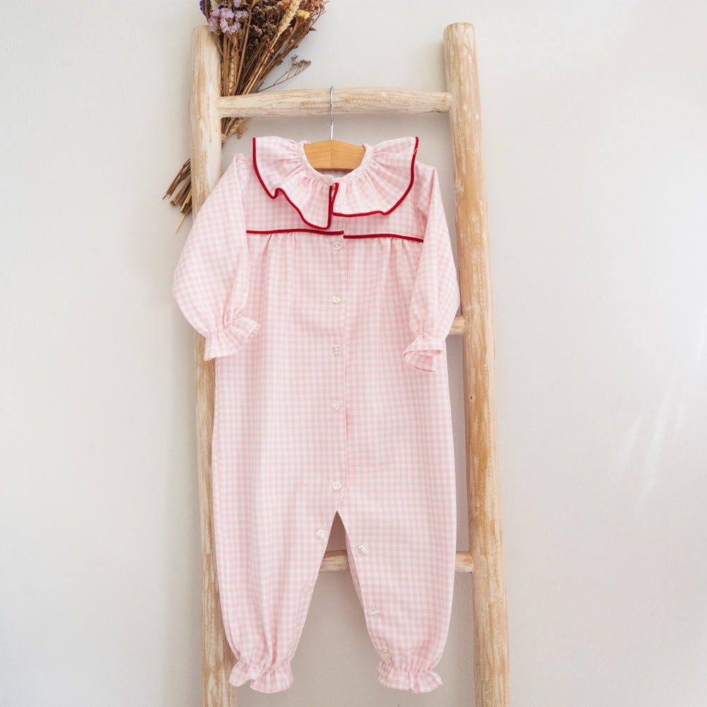 Our cotton Baby Pajamas feature a charming pink stripe pattern and a delicate ruffle collar for an extra touch of sweetness. Soft and comfortable, it’s perfect for keeping your little one snug and stylish during sleep or play. Made in Portugal