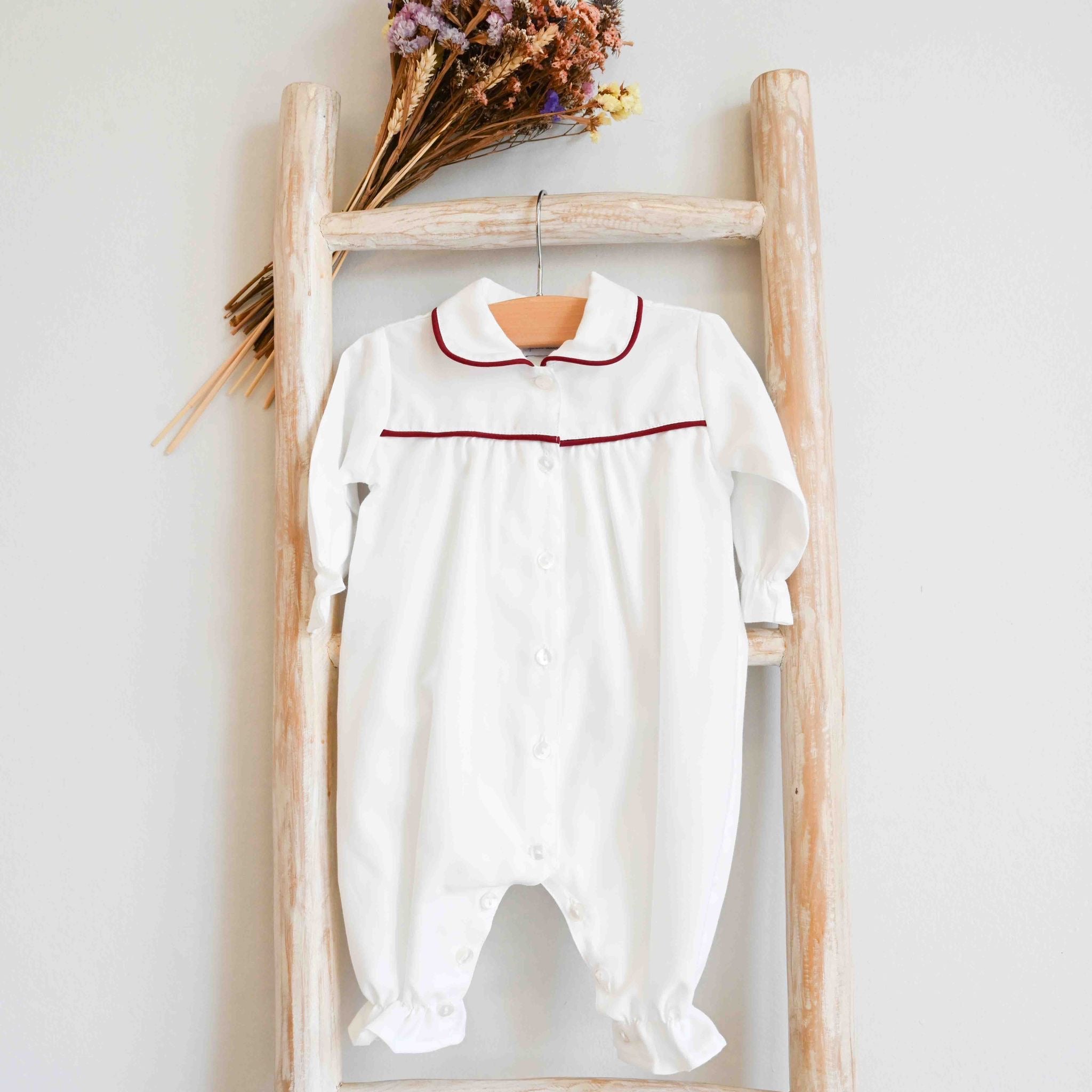 Our cotton Baby Pajamas feature a charming burgundy trim on chest and a delicate Peter Pan collar for an extra touch of sweetness. Soft and comfortable, it’s perfect for keeping your little one snug and stylish during sleep or play. Made in Portugal
