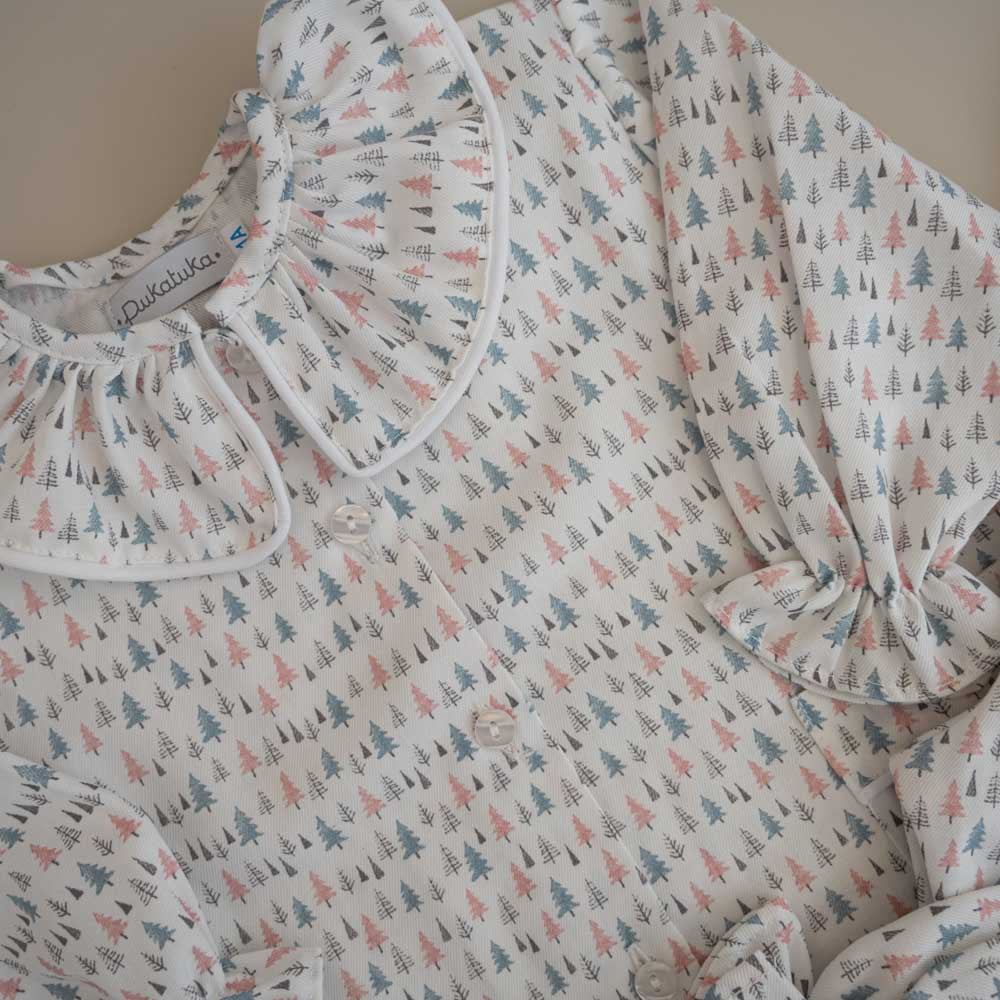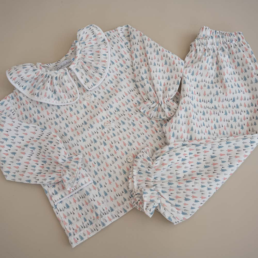 This charming pajama set features long sleeves and long legs, offering comfort and warmth for a cozy night’s sleep. The delicate ruffled collar adds a touch of elegance, while the front pockets provide a cute detail. Available in a variety of patterns, it’s perfect for adding a little style to bedtime.