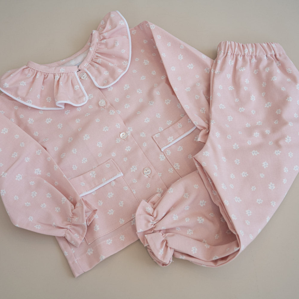 This charming pajama set features long sleeves and long legs, offering comfort and warmth for a cozy night’s sleep. The delicate ruffled collar adds a touch of elegance, while the front pockets provide a cute detail. Available in a variety of patterns, it’s perfect for adding a little style to bedtime.