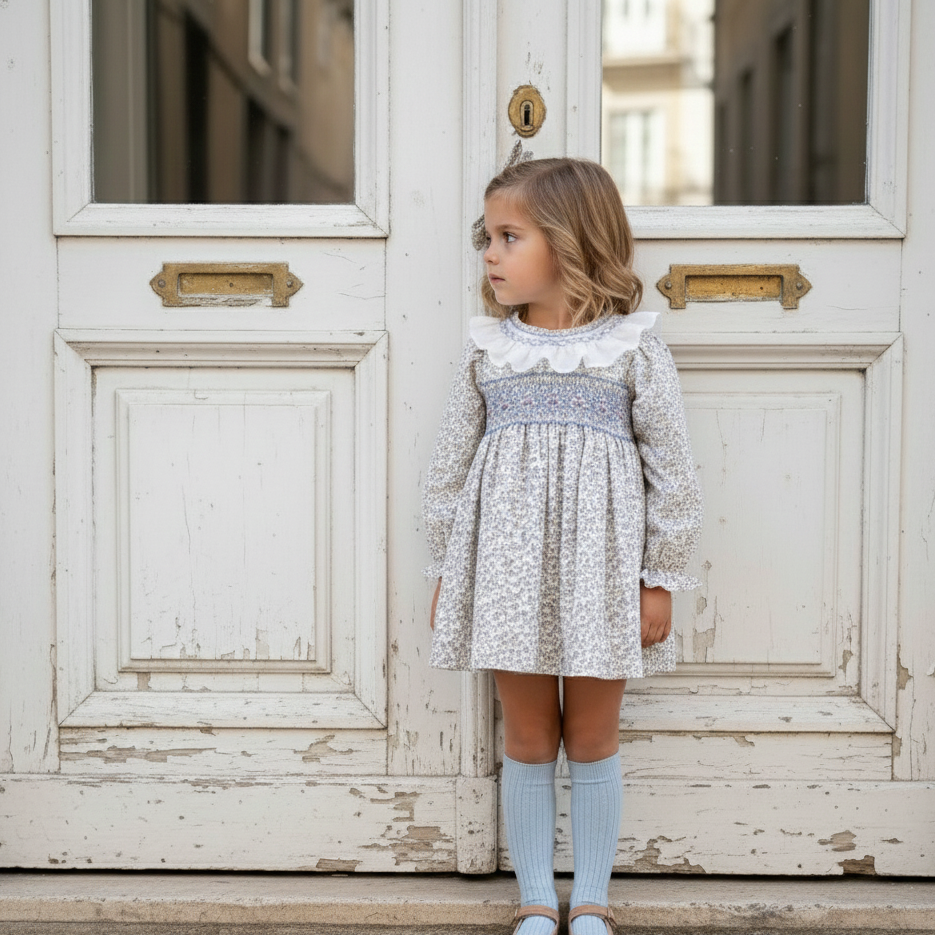 Hand Smocked Floral Dress with Ruffled Collar
