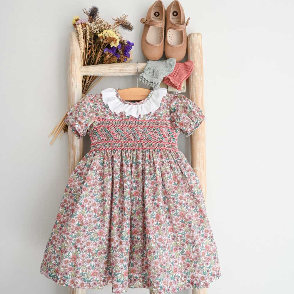 Elegant dress in a floral fabric with a hand-embroidered smocked bodice and frilled collar. Fully lined for comfort, featuring a tie-back belt for a perfect fit. Made in Portugal. 100% cotton