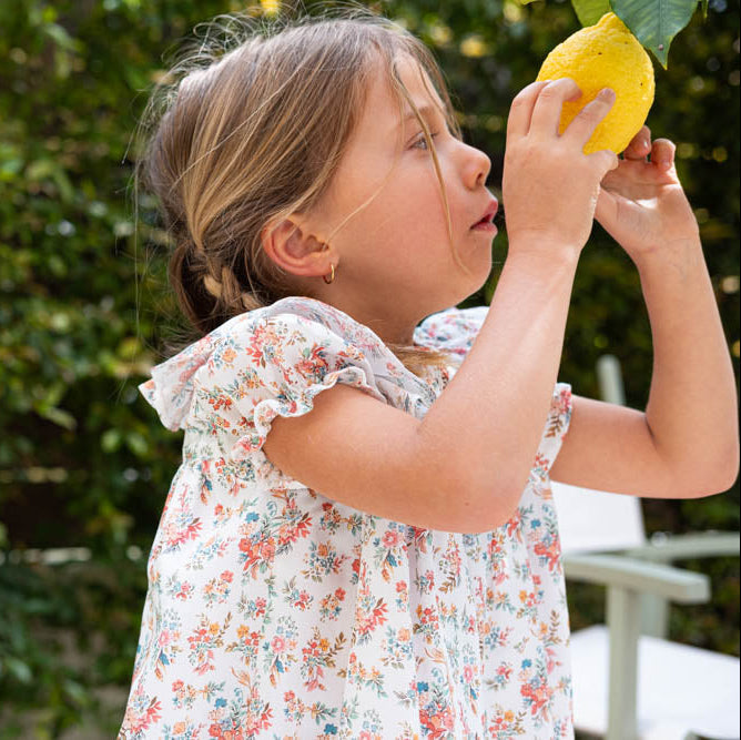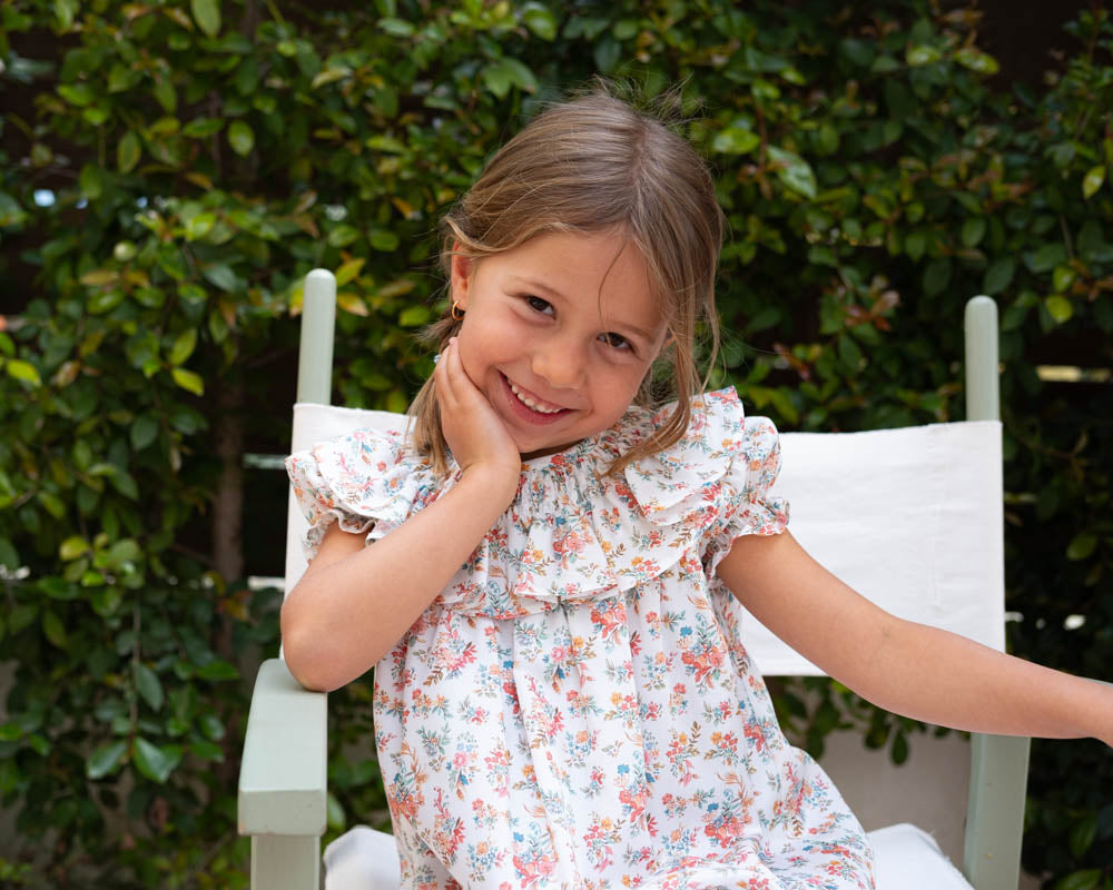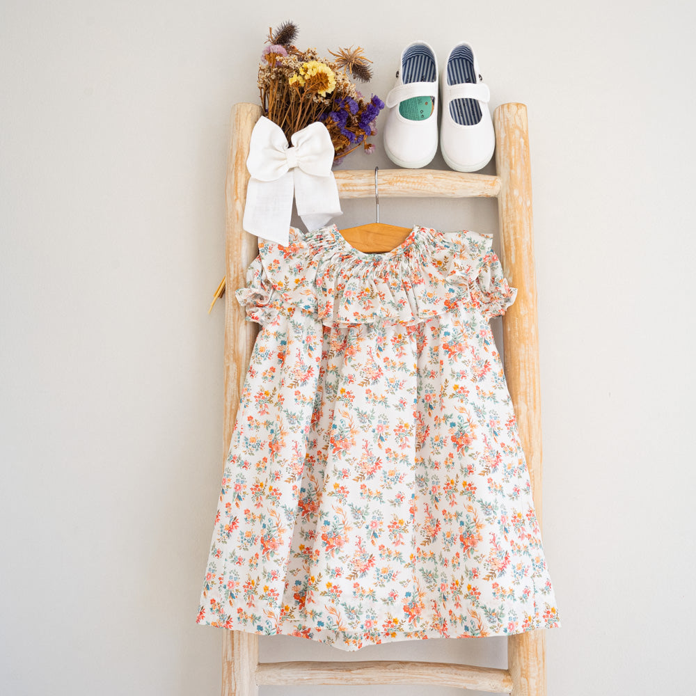 Adorable and elegant, this Floral Dress features a delightful pattern in shades of salmon, coral, pink, and green, beautifully complemented by a smocked collar. Fully lined for your little one’s comfort, it’s a charming choice for any occasion.