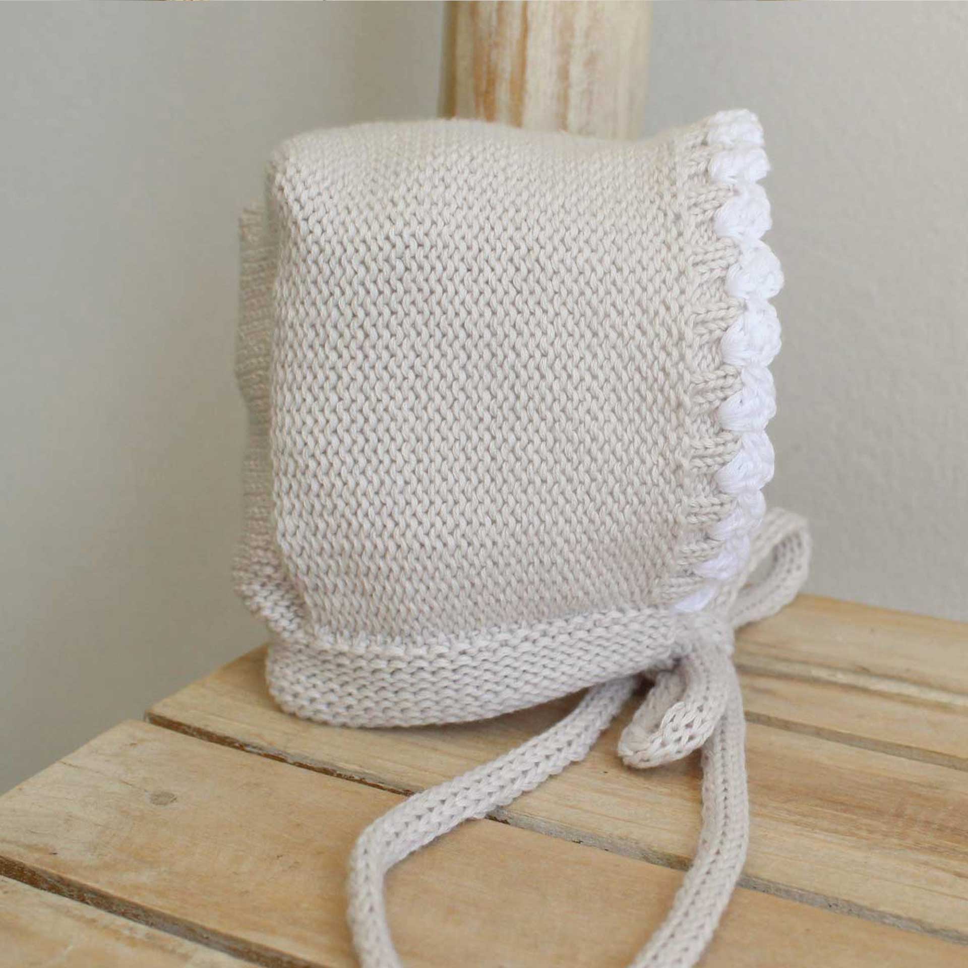 Delicately designed, our cotton Knitted Bonnet features charming handcrafted scalloped details, adding a unique and elegant touch. Soft and snug, it secures with a tie cord that forms a sweet bow, ensuring a perfect fit. Made in Portugal