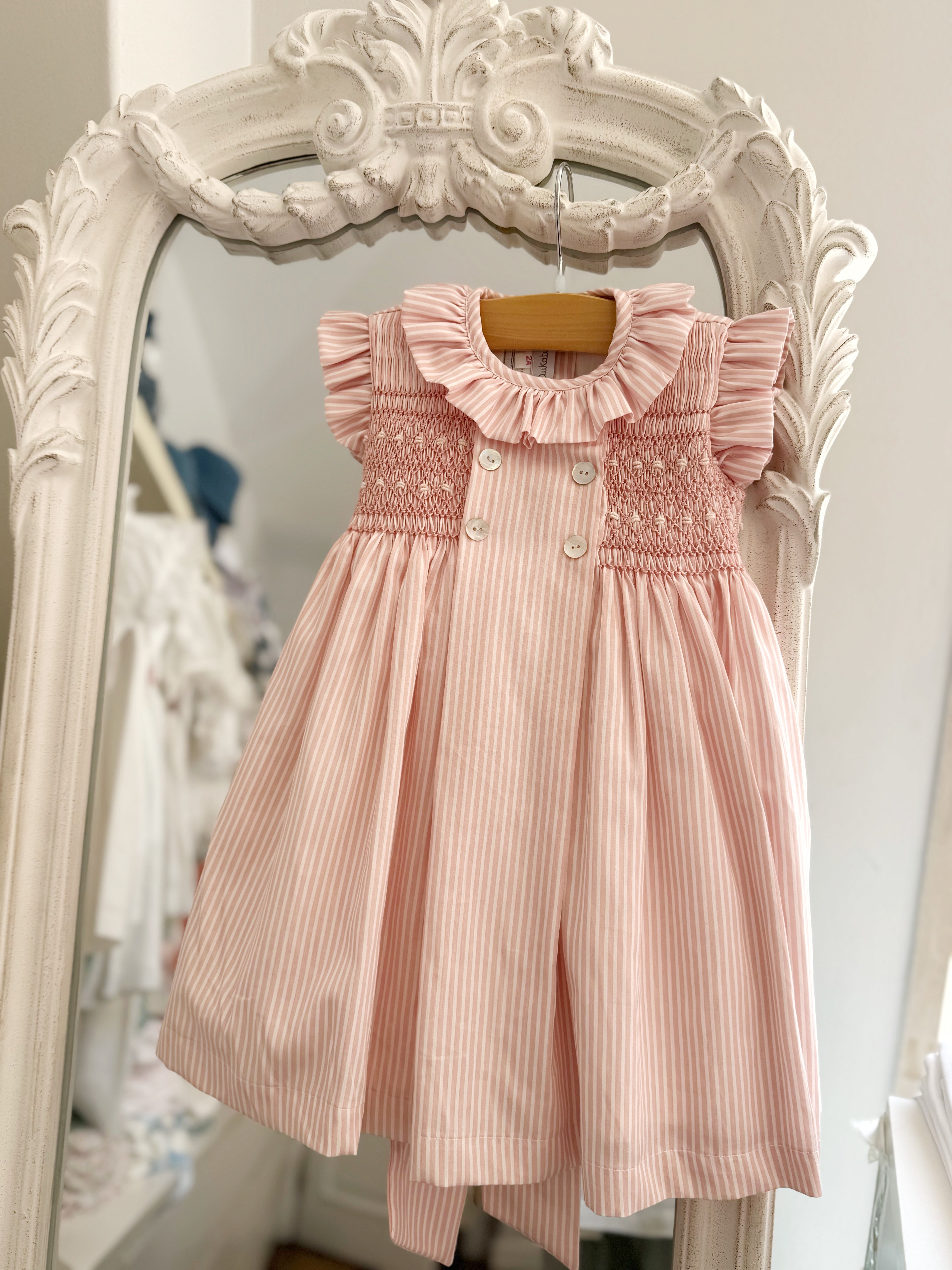 Pink Stripes Smocked Dress with Hand-Embroidery and Back Bow