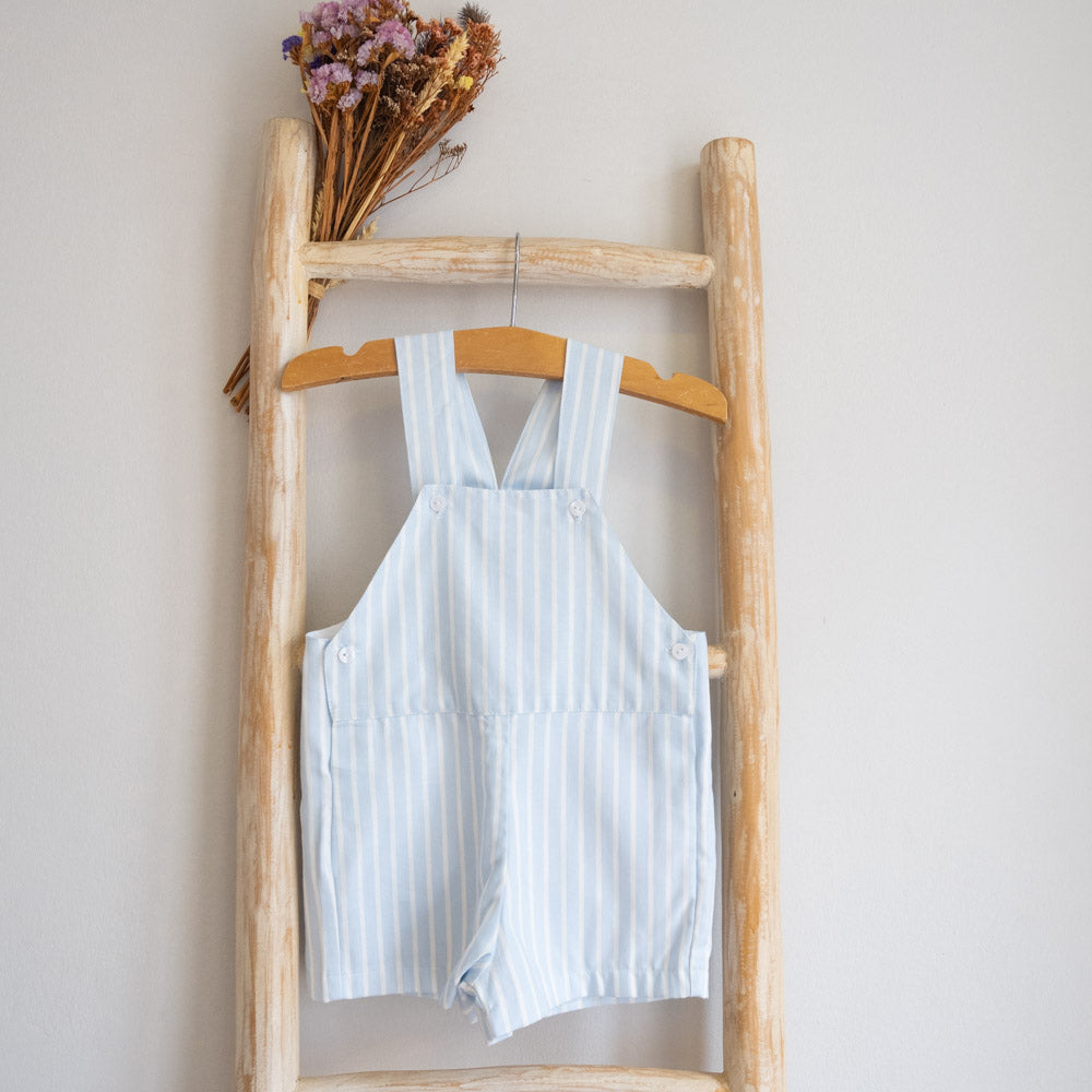 Lightweight and versatile short overalls with a classic blue and white stripe pattern. Fully lined for comfort and perfect for warm days. Made in Portugal.