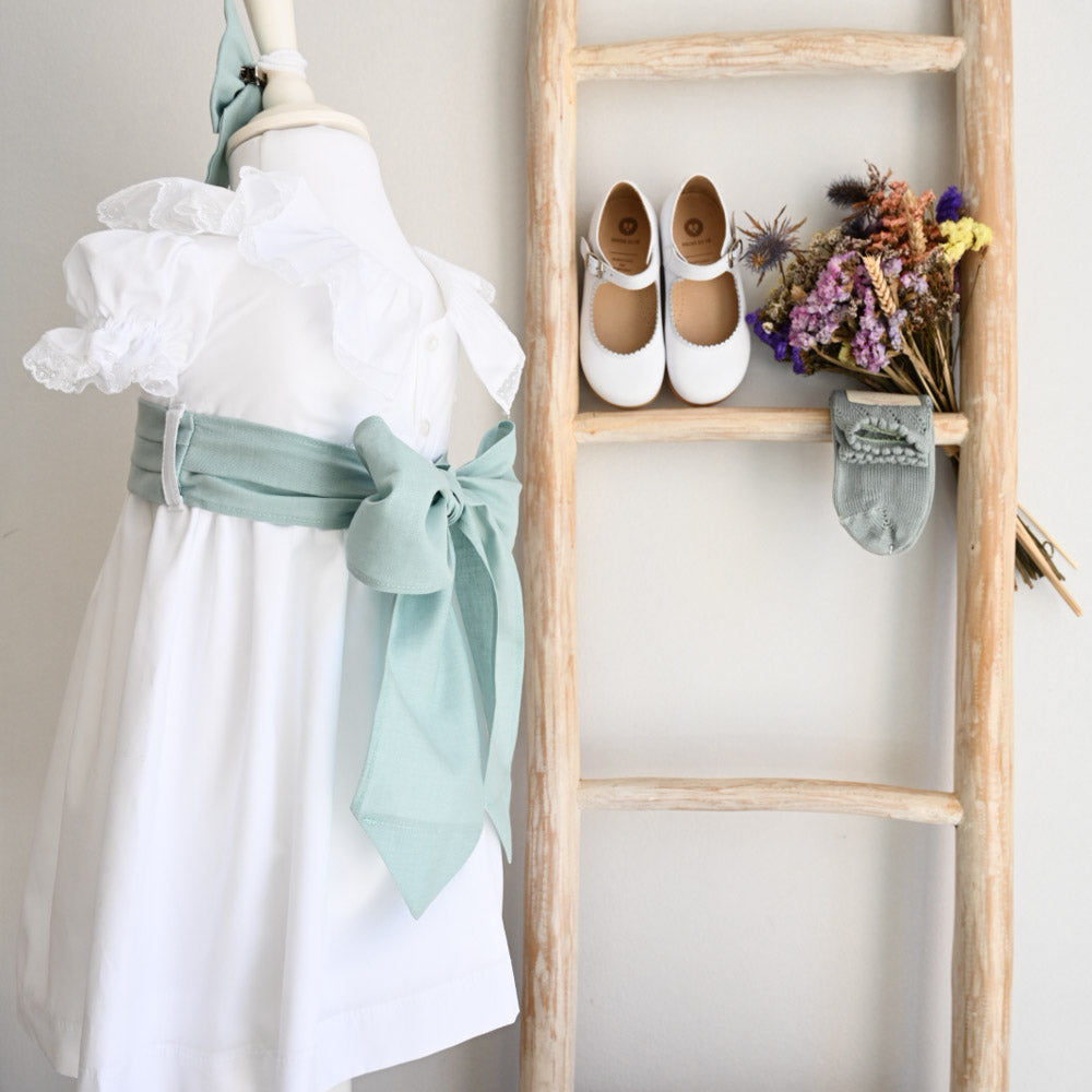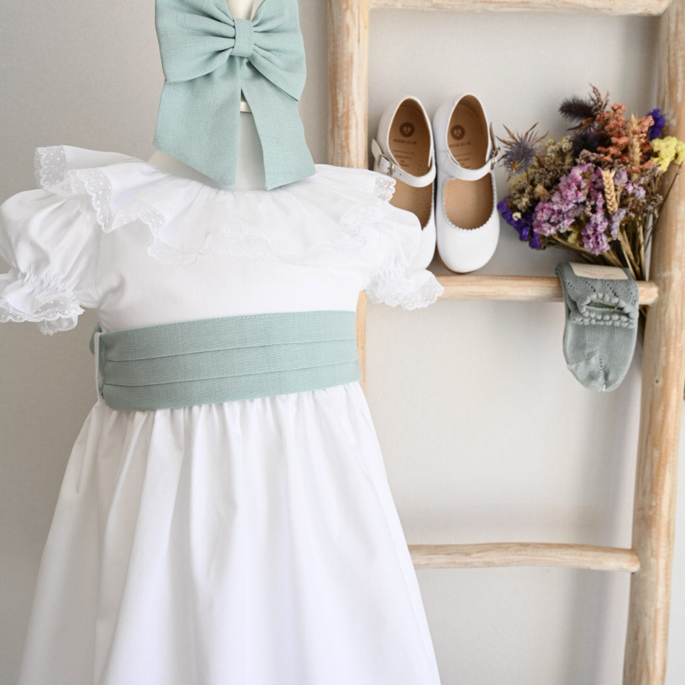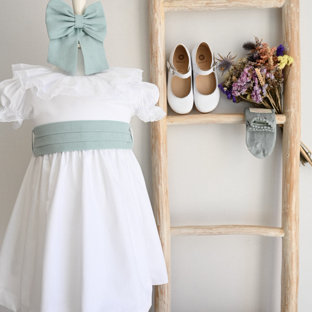 Charming dress featuring a V-back neckline, ruffled collar with delicate lace details, and puff sleeves with lace trim. Tie-back sash, available in customizable colors, adds a special touch. Ideal for special occasions like baptisms and weddings. Made from 100% cotton and produced in Portugal.
