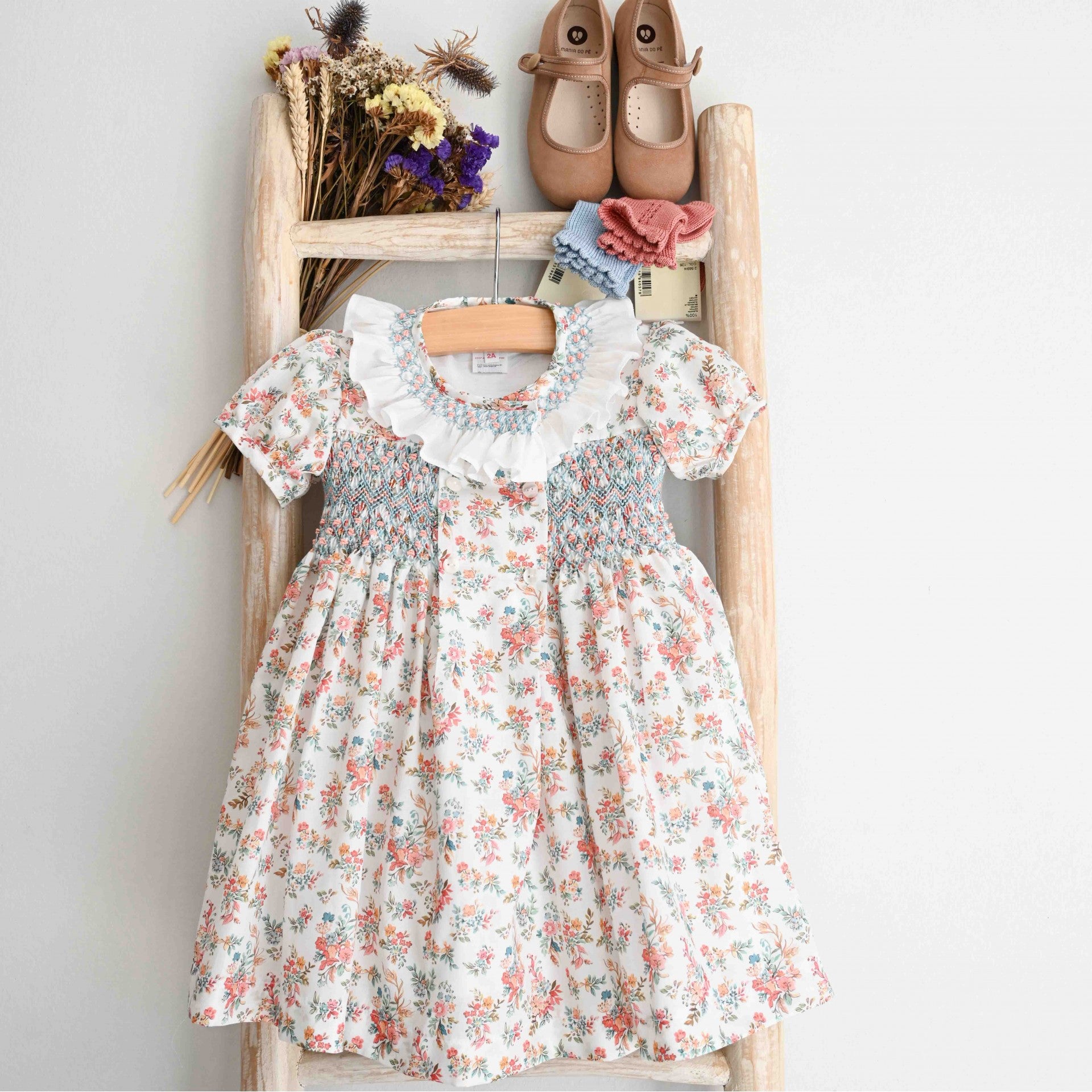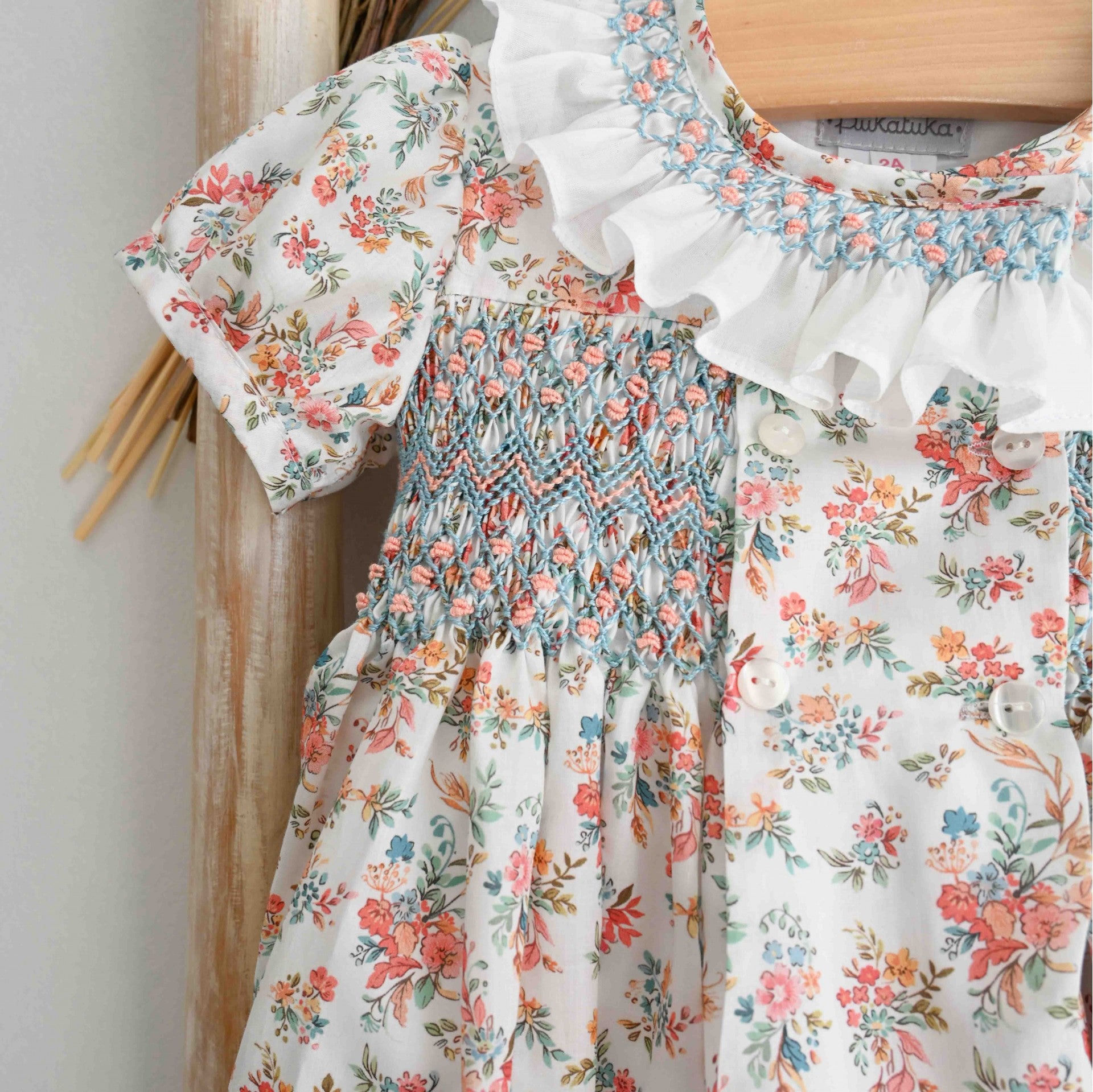 Vestido com padrão de flores em tons de salmão, verde, coral e azul com peito e gola bordados à mão. Tem faixa que aperta atrás a dar laço e é totalmente forrado. Produzido em algodão num tecido suave, é perfeito para um dia mais especial. Feito em Portugal
