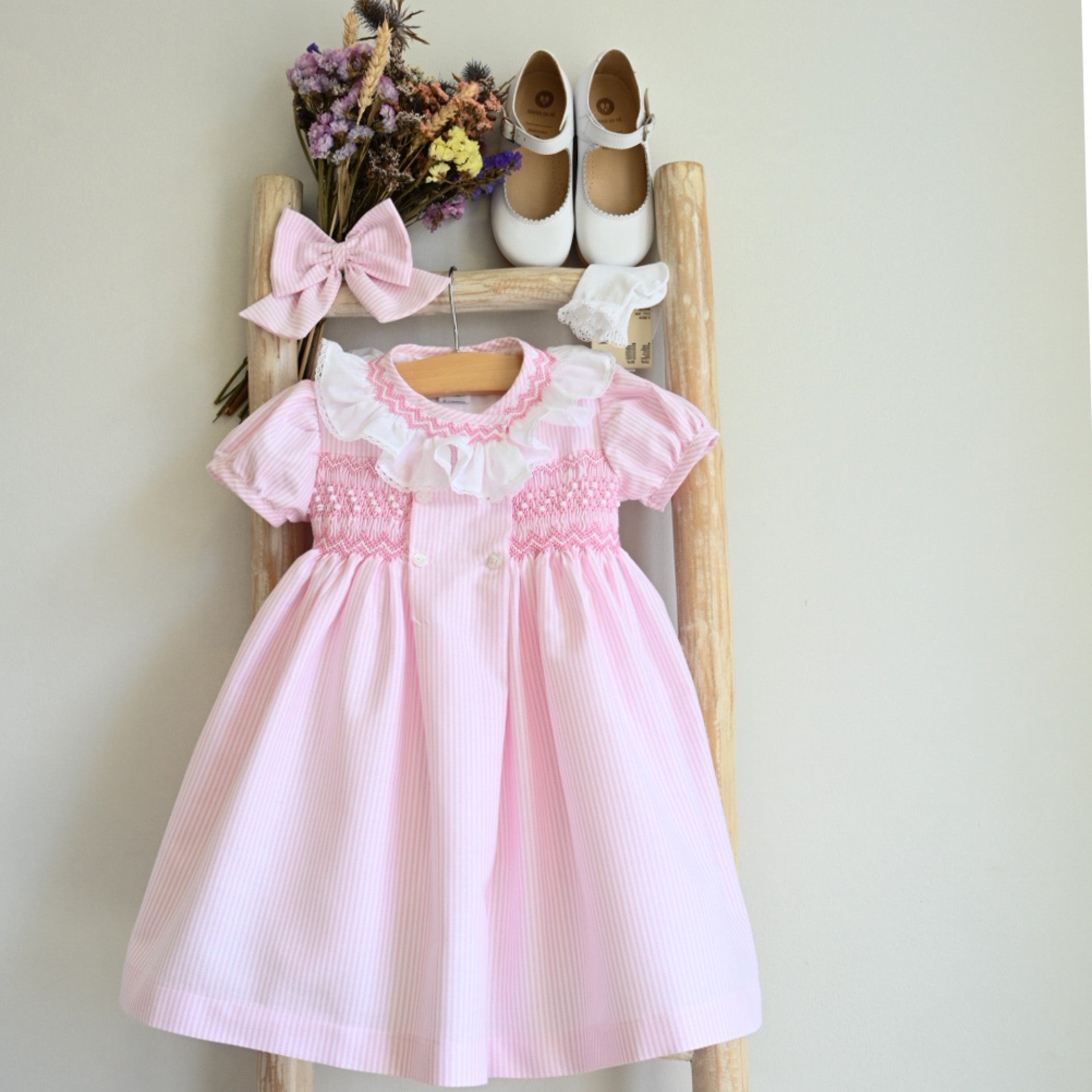 Vestido com padrão de riscas rosa e favos bordados à mão no peito e gola. Manga balão e cinto que aperta atrás a dar laço. Forrado. 100% algodão e Fabricado em Portugal